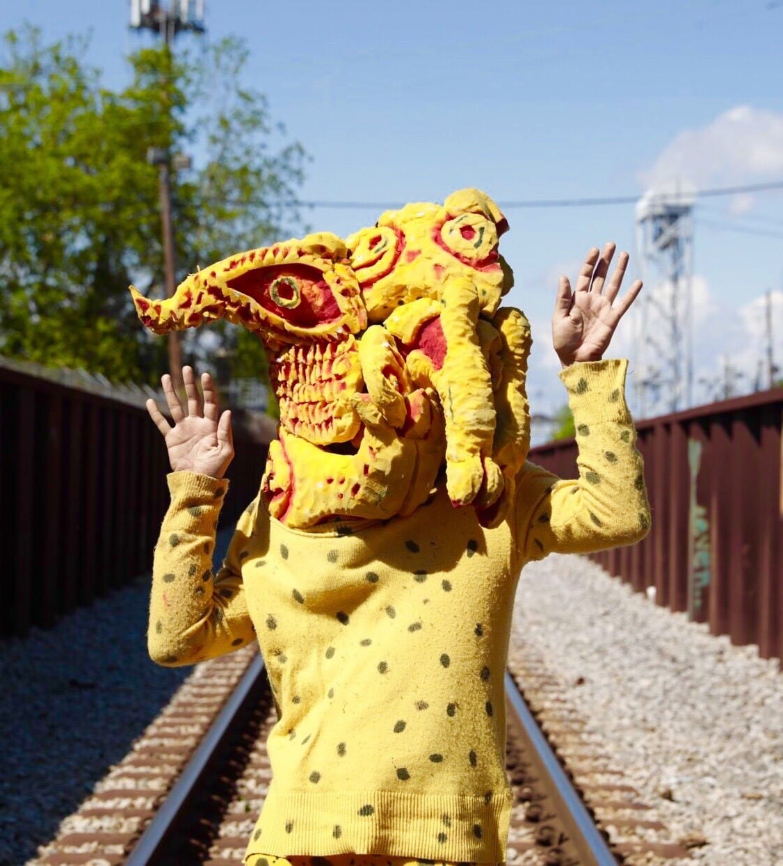 Founded in 2012 by twin brothers Pablo and Efrain Del Hierro, Puerto Rican experimental puppetry troupe Poncili Creación fuses a DIY punk aesthetic with traditional folk motifs and a boisterous exuberance to create their own brand of “performative sculpture,” as they call it. The tirelessly touring Del Hierro brothers craft their costumes primarily from polyurethane foam, which they find in whatever city they happen to be in, tearing into discarded couches or mattresses and ripping out the “meat” inside. From this raw material they create bold, playful, brightly colored masks, headpieces, or full-body outfits that they bring alive in spirited performances, often accompanied by noise soundtracks. (They were welcomed early on by Miami’s noise music scene, the brothers told Art Papers recently.) They often end performances by ripping apart their costumes and distributing the pieces to the crowd — a kind of irreverent, inclusive eucharist. The group’s name, derived from the term poncilidad, which they define as “chaotic tranquility,” reflects the mix of rigor and improvisation that characterizes their live sets. Traditional black box theater this ain’t.