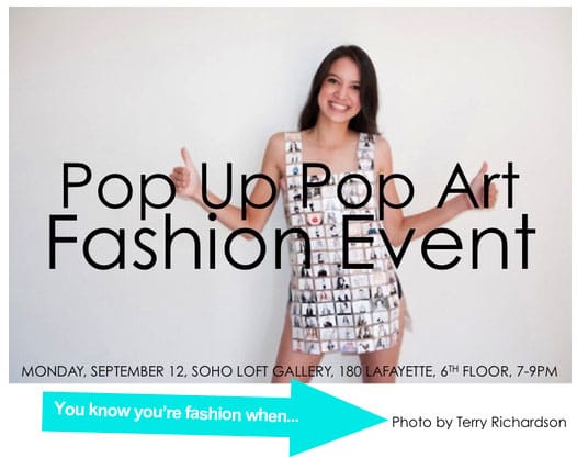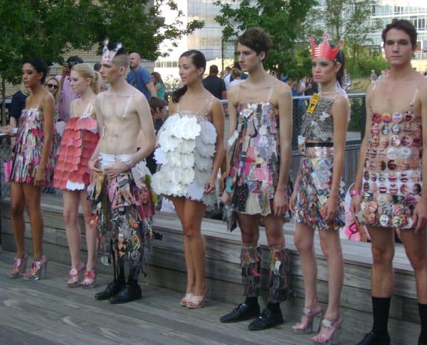 Her collection, or “wearable art” as she describes the looks, walked the runway Monday evening for the first time on the Highline. Though initially the clothes lack the sophisticated look of Rabanne’s sparkling swing dresses, instead they project a plastic Pop art vibe with each outfit and accessory made out of laminated magazine clippings. Exuberant nightlife personalities peppered the model lineup, including Jocelyn Saldana sporting a cocktail dress and pumps created with images of lipstick and Darian Darling, who donned a halter dress pieced together with photos of runway models.