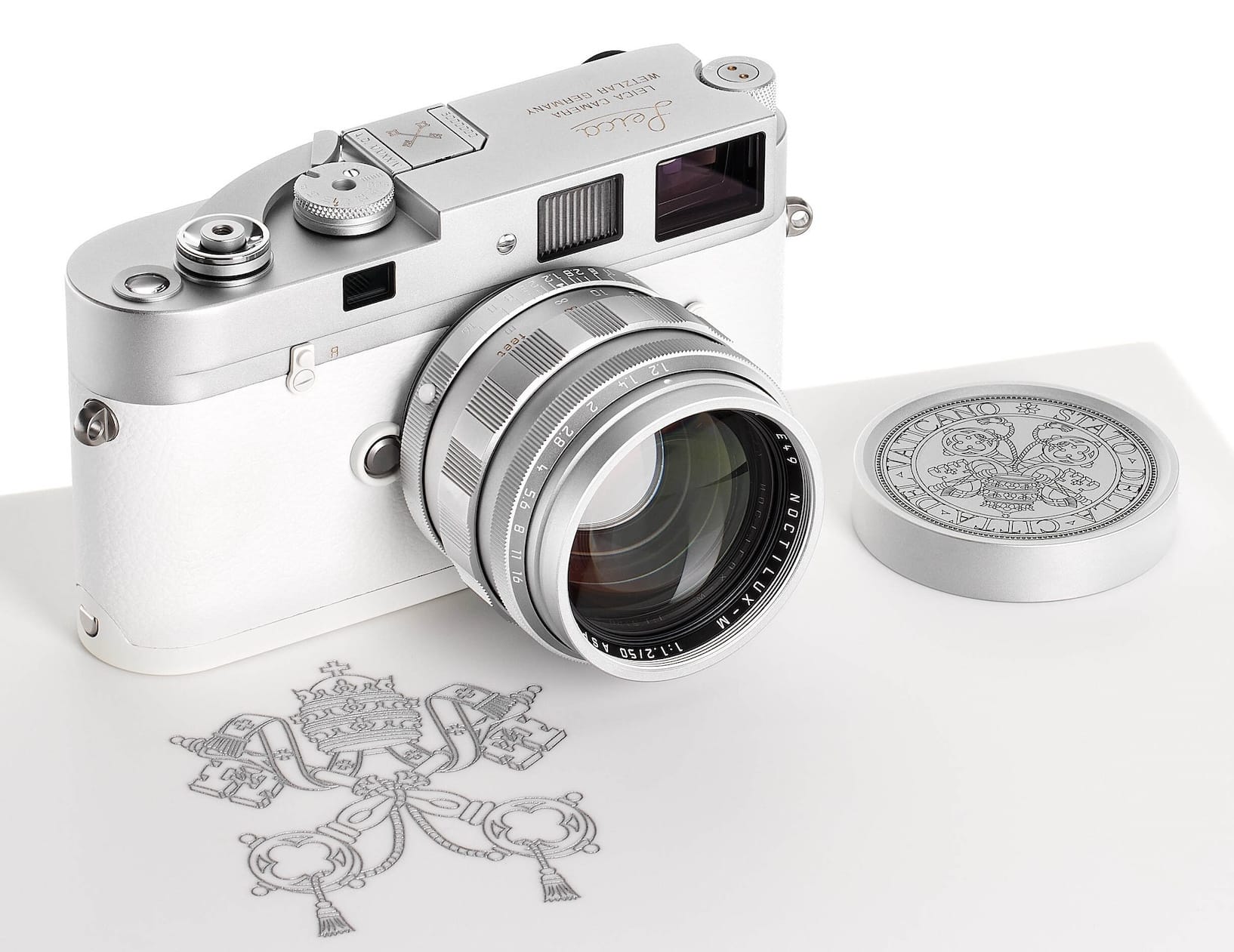 Both the body and lens caps are engraved with the Coat of Arms of the State of Vatican City, and the camera and lens include an etching that reads "AD MMXXIV," the year Leica presented the Pope with the gift in Roman numerals.