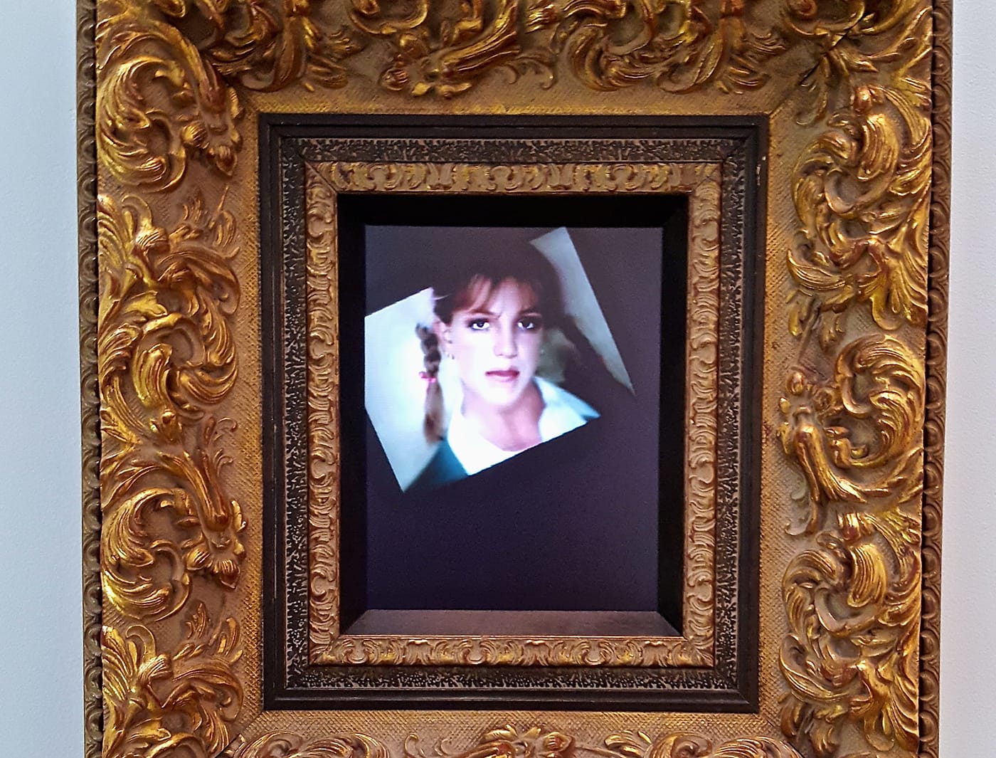 LOUISVILLE, Kentucky — At the foot of the stairs leading down into the main gallery space of the 21c Museum Hotel Louisville hangs a kinetic digital portrait of pop star Britney Spears in an ornately gilded frame. The video sequence “(Pop) Icon: Britney” (2010) by R. Luke DuBois cycles through still captures from music videos throughout Spears’s decades-long pop canon, isolating her face and aligning the digital fragments so that her eyes remain fixed throughout. As she gazes out at the viewer, all of her other features morph, capturing moments in a time-warp through the creative output of a meteoric and scandal-laden career.