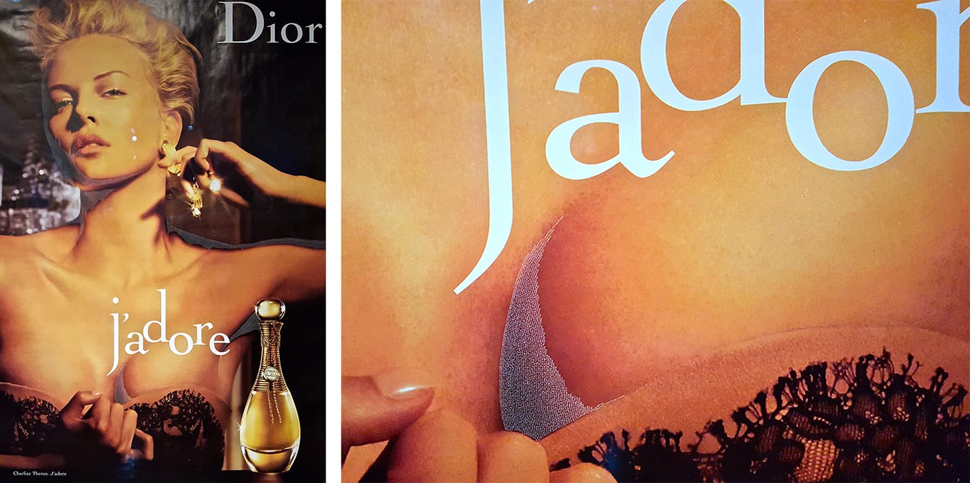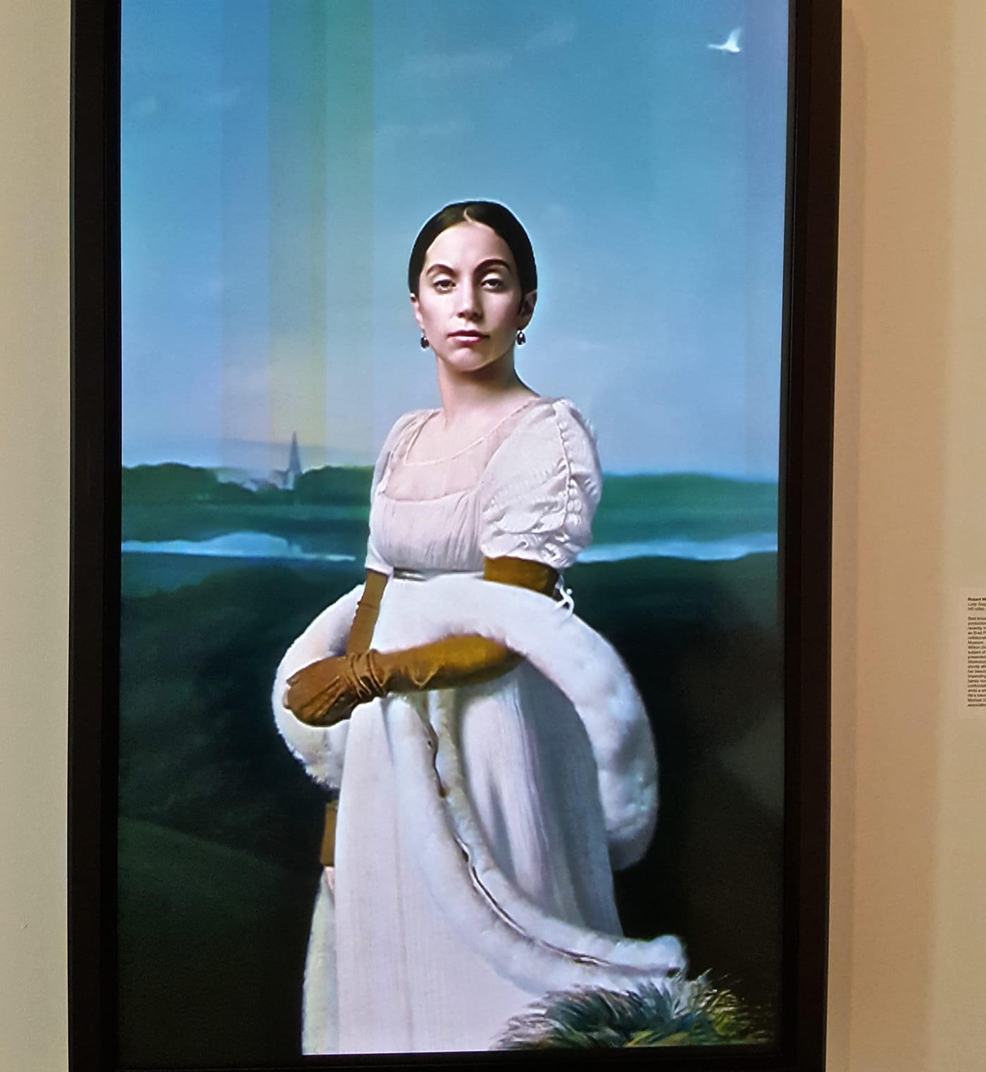 The works that most powerfully and literally present celebrities as the modern religious icons are found in the vaulted main gallery. Graham Dolphin obsessively fills iconic album covers with fields of minuscule writing in white ink, leaving them abraded and presenting Bible verses and other messages in a manner that is both visible and subliminal (another work in the upstairs gallery fills in the shadows of a Dior perfume poster with the full text of Exodus 1-25). There are numerous portraits that interpose celebrities and fine art, such Robert Wilson’s video portrait of Lady Gaga as a stand-in for Mademoiselle Caroline Rivière from a 19th-century portrait of the same name by Jean-Auguste-Dominique Ingres.