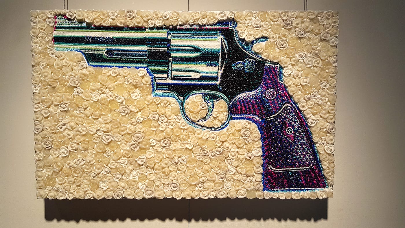 Stites references the writings of critic and professor Arthur Danto, whose writing prominently grappled with the conceptual issues being raised by then-emerging Pop artist Andy Warhol. Indeed, many of the smaller galleries flanking the main room present works in direct conversation with the Pop artists who began exploring this inextricable connection between fine art and pop culture. There is a trio of Lichtenstein takeoffs by Greg Gossel, a rather double-take inducing conglomerate image of Marilyn Monroe and Elvis Presley, and a series of works by Lisa Alonzo, who uses pastry chef tools to render images of commercial beverages, like Diet Coke and Red Bull, as well as a gun in gaudily decorative rosettes and flourishes.
