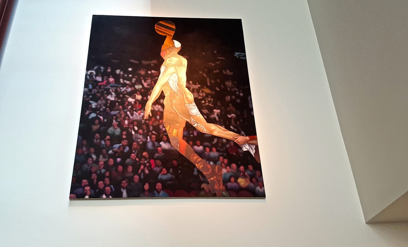 A number of artworks explore our paradoxical deification of sports stars, even as we require the sacrifice of their bodies, such as “Se é pra ser amor, que marque a alma! (If It’s Meant to Be Love, May It Brand the Soul!)” (2016) by Brazilian artist Alexandre Mazza, a video portrait and endurance performance shot over hours of a boxer; and “The Ascension” (2016) by Titus Kaphar, which elides Michael Jordan’s figure from an action painting of him dunking, and fills in the negative space with imagery of a crucified Christ from Rogier van der Weyden’s “The Descent from the Cross.”