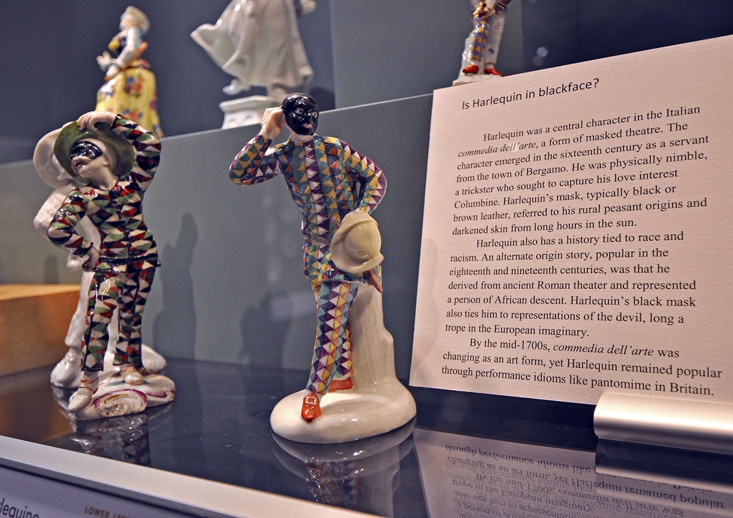 There’s a curious collection of 18th-century porcelain figurines displayed on the second floor of the Gardiner Museum. Set amidst an impressive display of European ceramic table wear and figurines, this small assortment of Harlequin sculptures don dark masks that stand out for contemporary audiences. One of the colorful sculptures is by Wenzel Neu and hails from the Kloster-Veilsdorf Porcelain Factory in Germany, c. 1764–65, and beside it is a sign that asks, “Is Harlequin in blackface?”