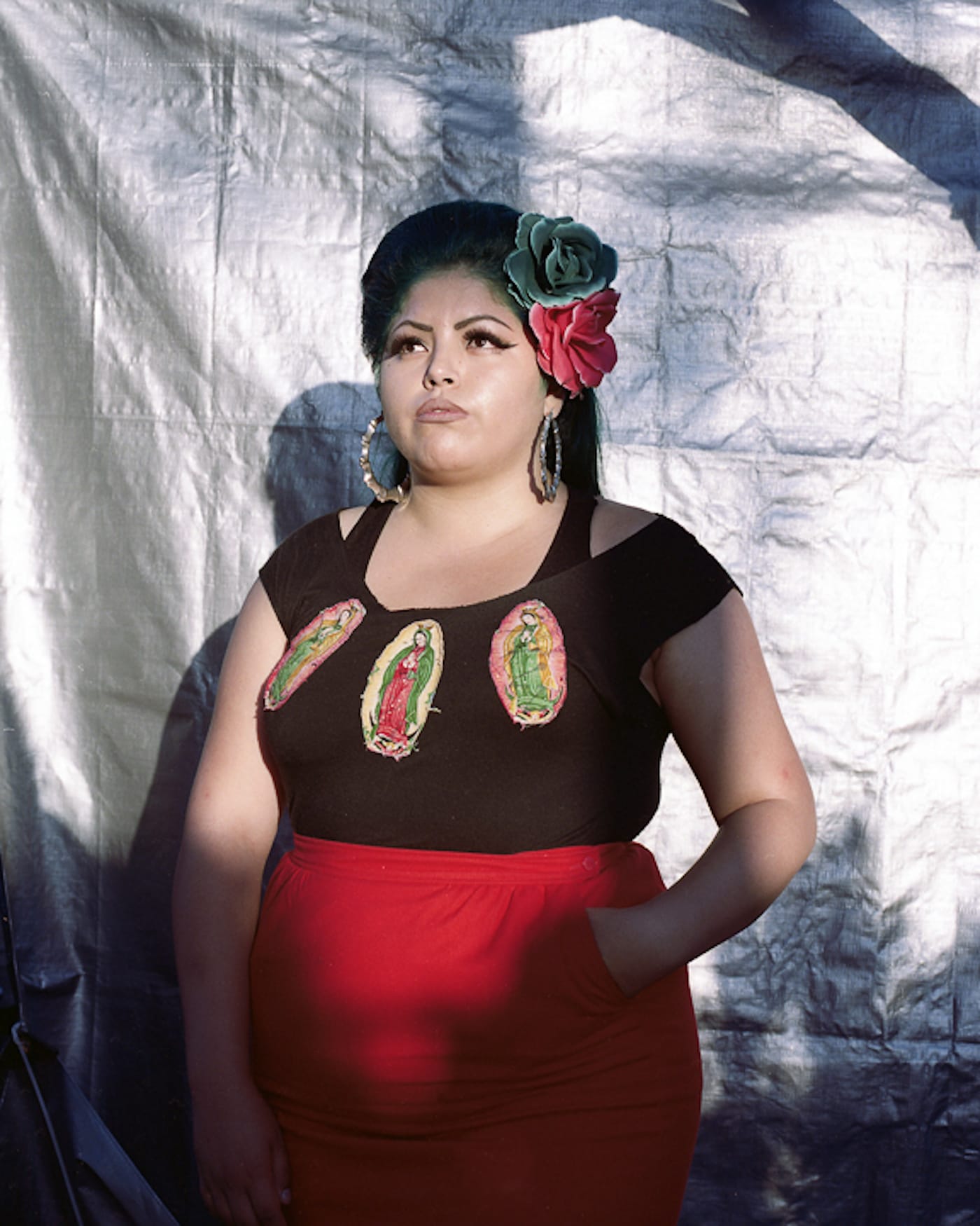 “Sandra” (2015) shows a woman with flowers in her hair, gold hoops in her ears, and thick eyeliner. Shadows creep on the background but also along her waist and arms. Her shirt shows Virgen de Guadalupe imagery. She looks into the distance, away from the camera.