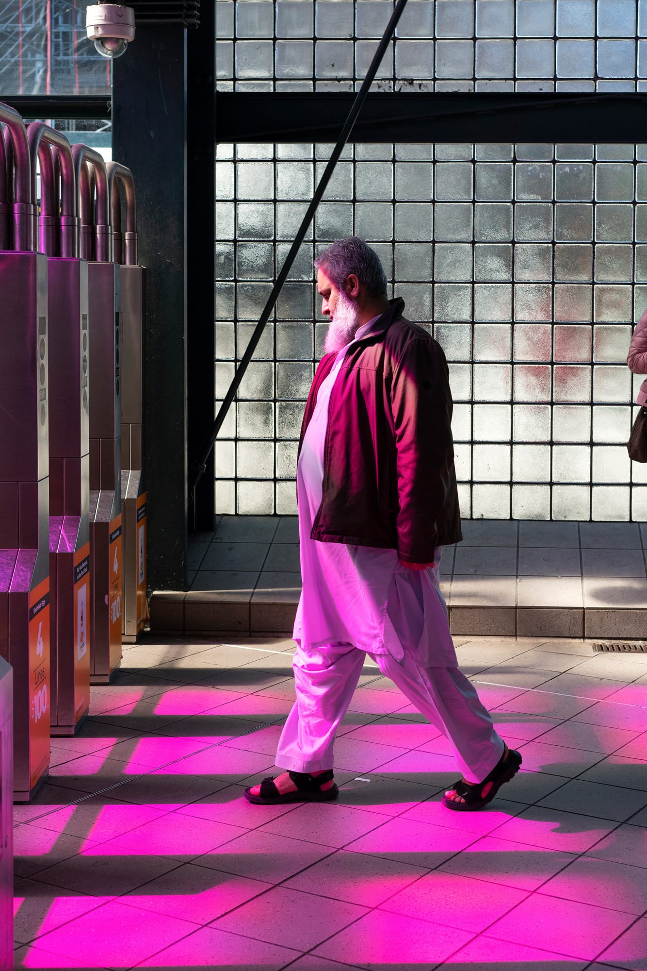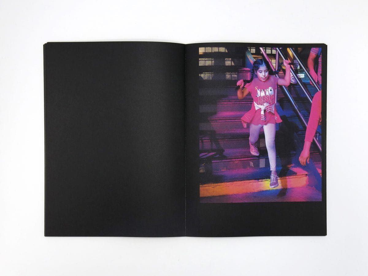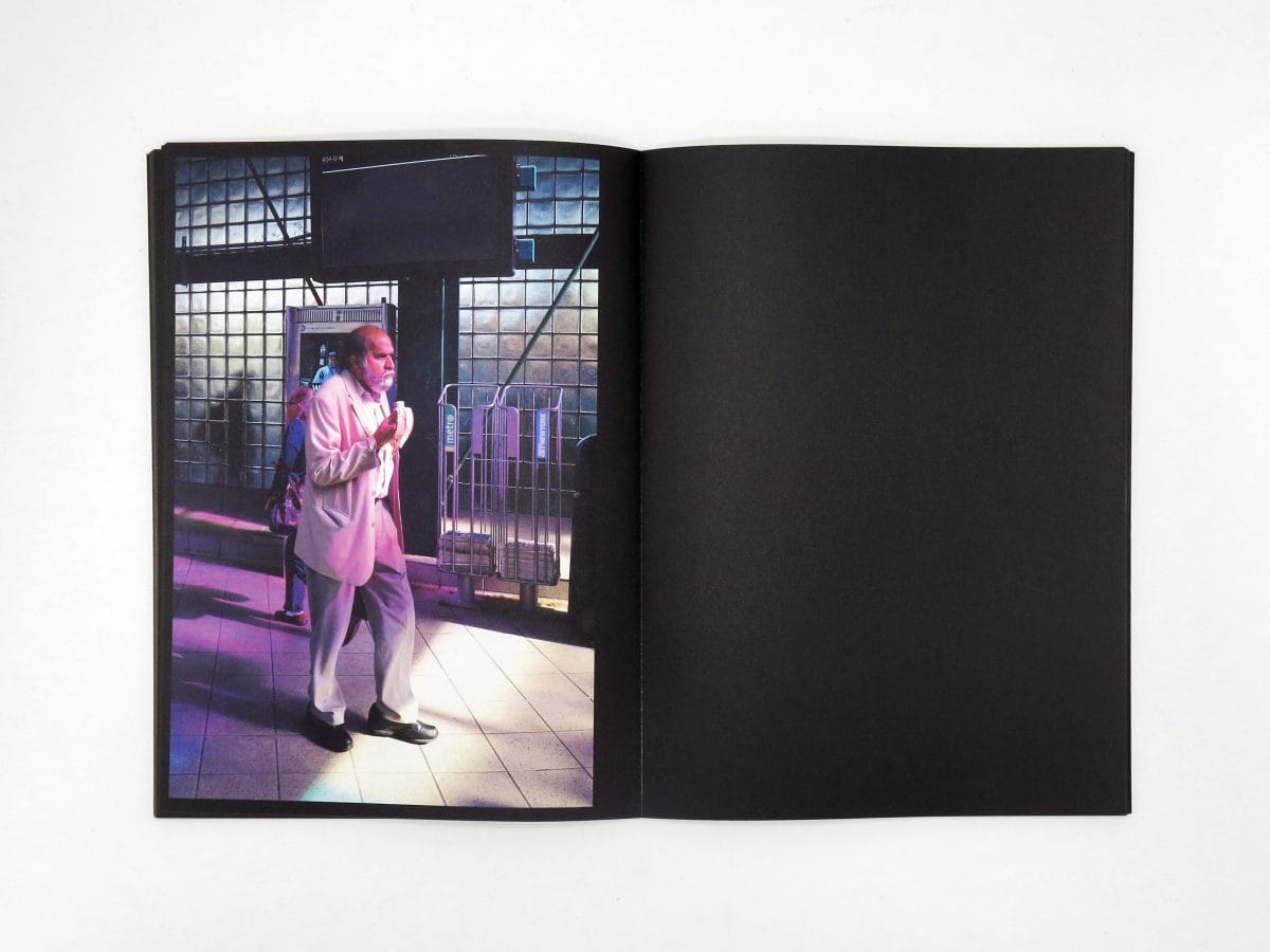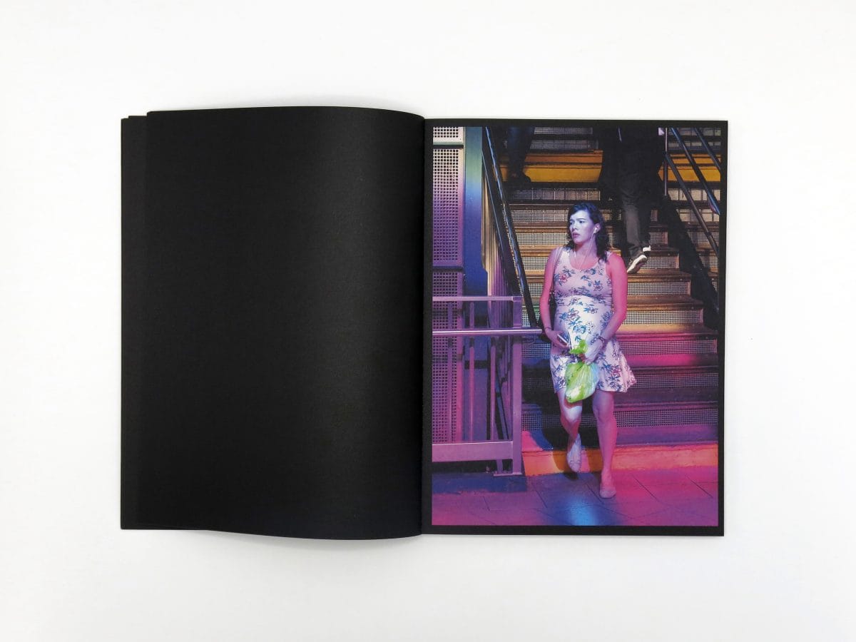 The book draws from Rothenberg’s series of photographs of passersby made between 2019 and March 2020 at the Jackson Heights-Roosevelt Avenue/74th Street train stop in Queens, New York, where the artist Tom Patti’s 2004 glass installation “Night Passage” fills the station during the daytime with dramatic, colored light. Despite its improvisatory premise, Roosevelt Station’s crisply cropped, high-focus photos present a thoughtful study of the solitary traveler’s mind and movements.