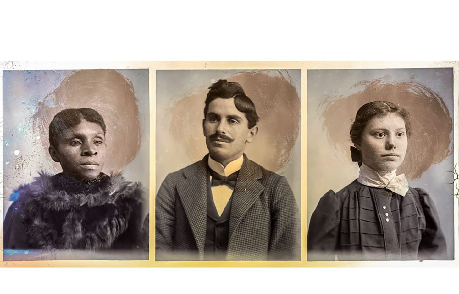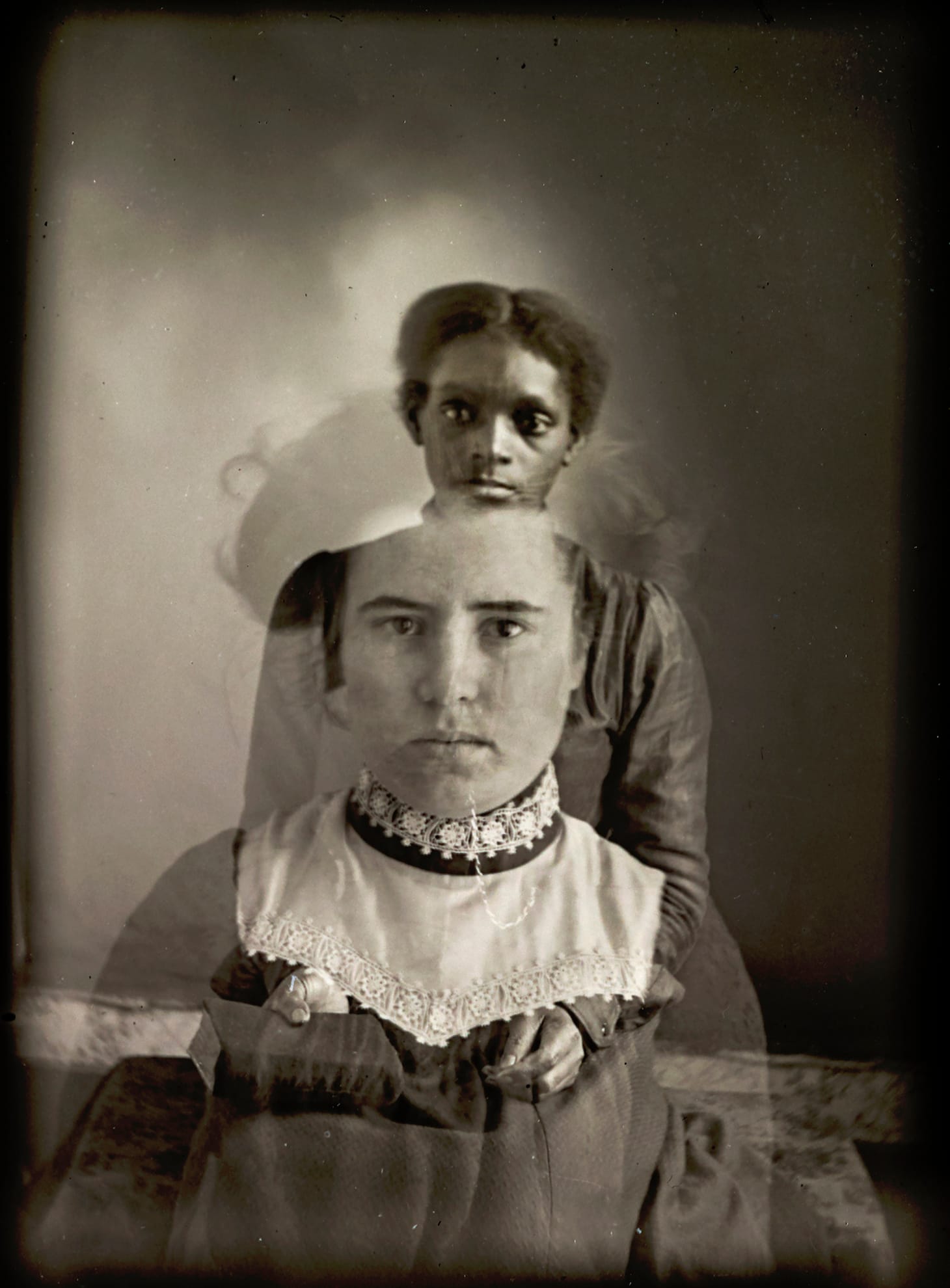 Several of the show’s featured photographs are plates consisting of two separate images exposed in the same frame, the only indication of distinct sittings is a vertical light variation that undermines Mangum’s nearly seamless suturing. In one such picture, two white-presenting girls, perhaps sisters, with big dark-colored bows atop their heads, share a rectangular plate with a black-presenting girl who has a white bow clipped at her crown. Their soft smiles, synchronicity of feminine adornment, and youth offer a sweet stereoscope of girlhood. Another, the portrait of a clear-eyed, black-presenting boy in a suit and a mustachioed white-presenting man, is a menacing image because of all the power differentials and manifest vulnerabilities that can be read into the vertical valley of light separating them.