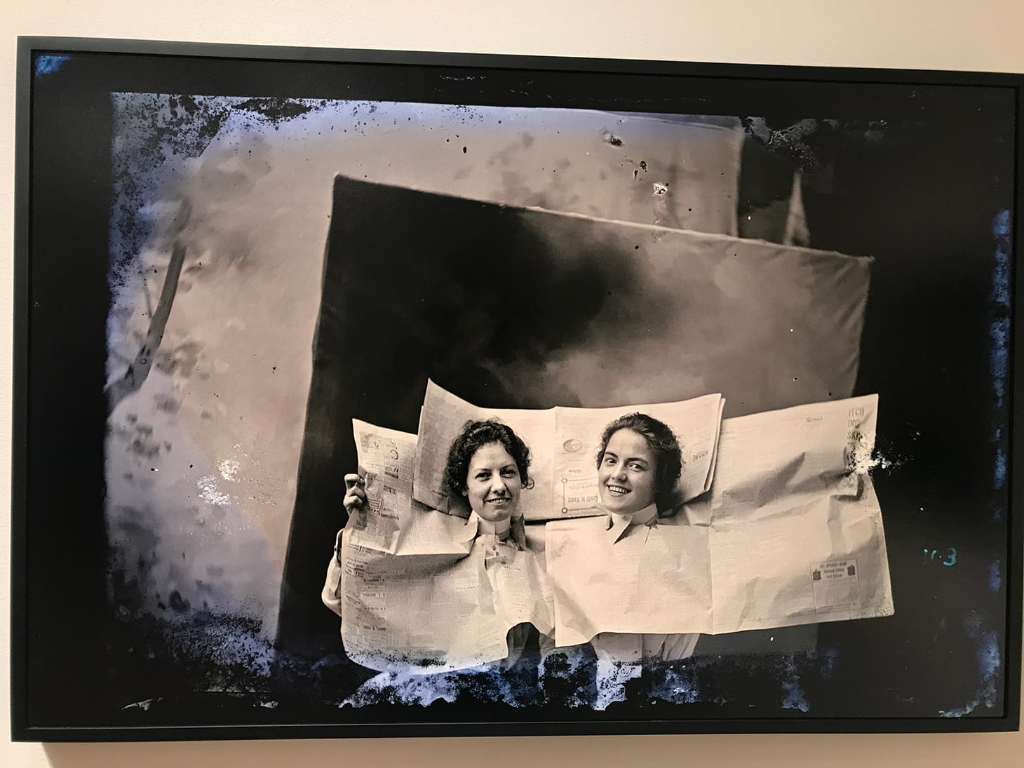 Mangum’s photos are prescient. His body of work — shots from his roving portrait studios and portraits made in more pastoral scenes — have garnered comparisons to contemporary artists like Sally Mann, Carrie Mae Weems, and Emmet Gowin. Children barefoot, outdoors, and distracted, are a captivating mainstay of the exhibition. The archetype of the New Woman that took hold at the precipice of the twentieth century is another clear influence: as ladies stand astride bikes, hold each other in intimate embraces, or playfully pop out of pre-cut newspaper pages.