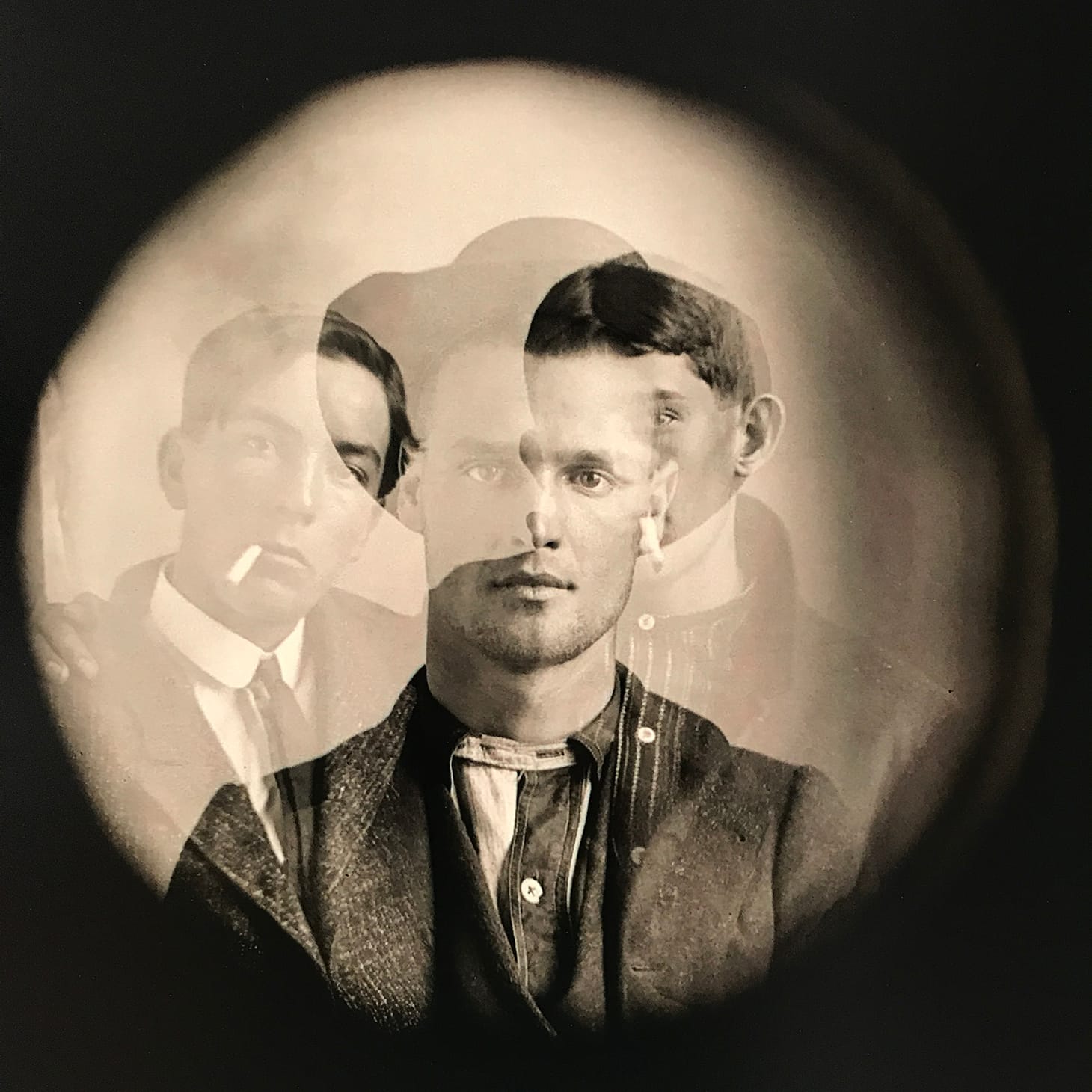 Many of Mangum’s photos — both stand-alone portraits and latticed negatives — bear multiple exposures, one over top another. Some of these seem intentional, a variation on the doppelgänger and spirit photographs popular in the earlier part of the nineteenth century. A sober-looking white-presenting man in a hat, for example, is interceded upon by two spectral white presenting young men, arms around each others’ shoulders, cigarettes hanging, like James Dean would have done it, from the sides of their mouths. In another, a black-presenting woman in a seated parlor pose appears to be emerging from the head of a white woman; the bulky book held in the first woman’s lap visible beneath the lace collar of the second. In other photos where three and four images wash over each other in the same frame, the overlap is more likely an economical efficiency necessitated by work on the road. Whatever Mangum’s impulse, the effect is a visual record of the deeply entangled interracial social life of the Jim Crow South — whimsical and haunting.