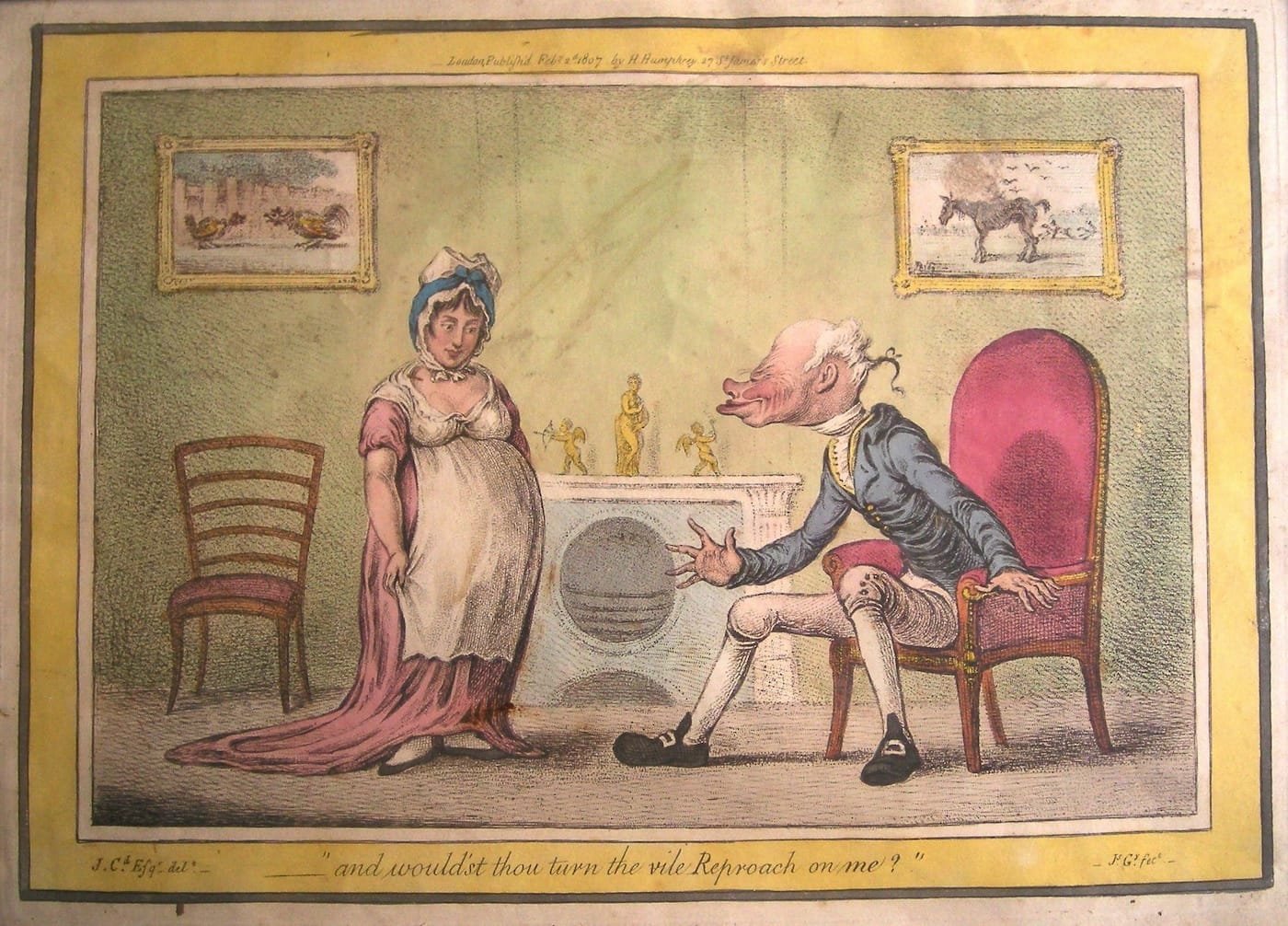 And then, in that same century, there emerged a curious fashion for what were described as “belly pads,” seen here in a hand-colored etching called ‘The Frailties of Fashion” of April 1793 by the great (and merciless) satirist Isaac Cruickshank.