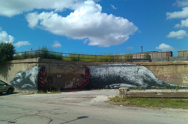 Chicago has a rat problem, and you would be justified in thinking that Belgian street artist Roa is paying tribute to the tenacious rodent. According to the Chicago Urban Art Society, which arranged for Roa to bring his distinctive style to this neighborhood, it is in fact a possum.