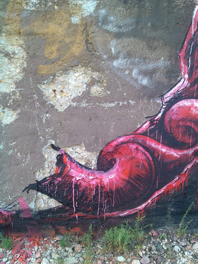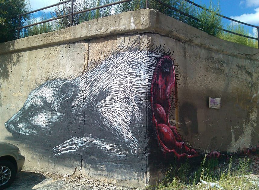 Typically of Roa’s murals, it’s painted in a sharp, graphic, linear style that resembles a woodcut print, and it stretches along a wall and around a corner for about twenty feet. The eye-grabbing detail is the way Roa painted the middle of the body — like a giant chunk has been gouged out, leaving a U-shaped hole and the remnants of bloody, twisted internal organs. Some of the red paint is sprayed on the dirt and weeds on the ground, giving the mural an extra dose of grisly realism. I’m not quite sure what it’s supposed to mean, exactly (it’s hard out there for a possum, maybe?), but I love it.