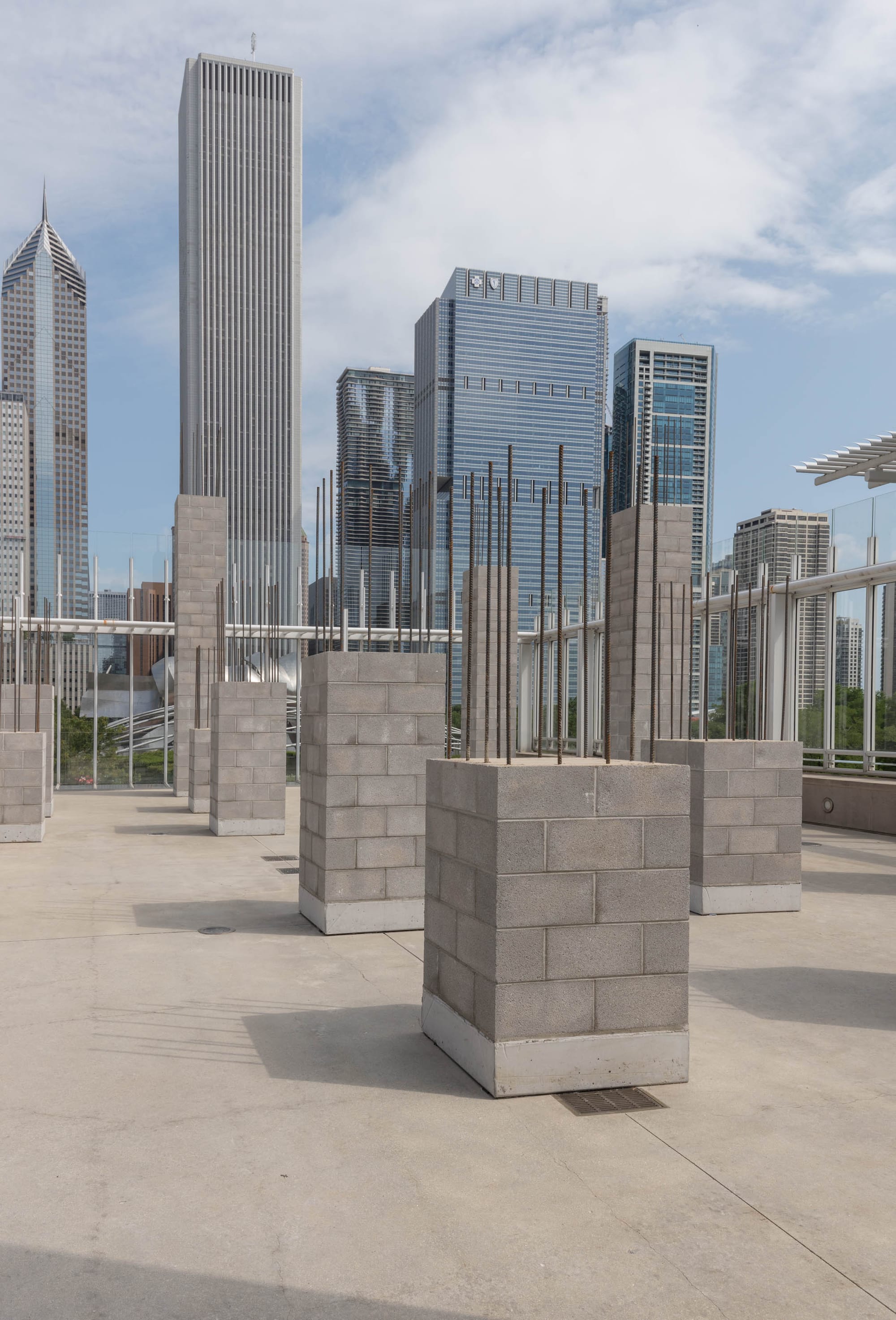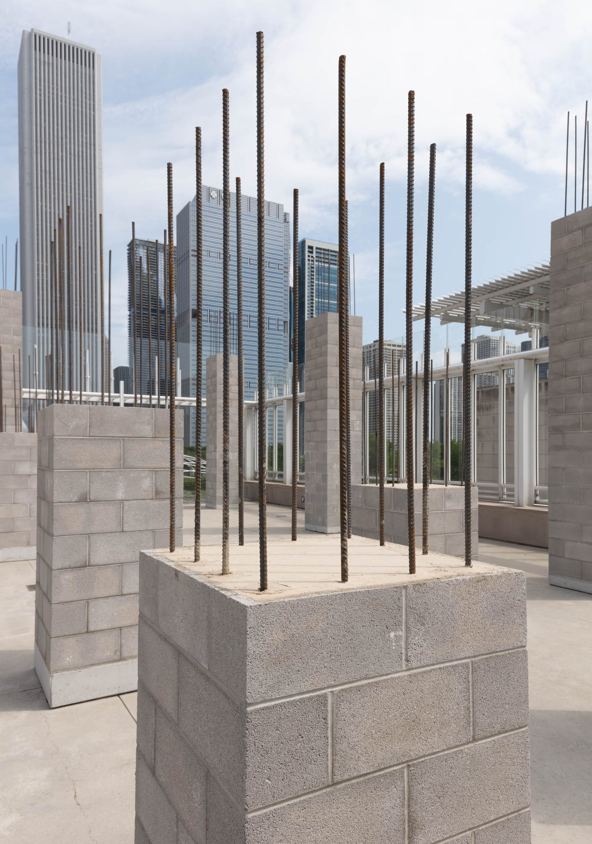 We recently met with Martinez and Twist, and had a chance to see the final phases of construction for With Each Incentive, the collective’s latest site-specific installation for the Art Institute of Chicago’s Bluhm Family Terrace. A grid of cinder block columns, with exposed rebar protruding through the top and surrounded by scaffolding, it was hard to tell if construction had just begun or was already complete. The final installation presents a grid of 18 columns of varying heights, peaking at 17’ tall and left purposefully unfinished.