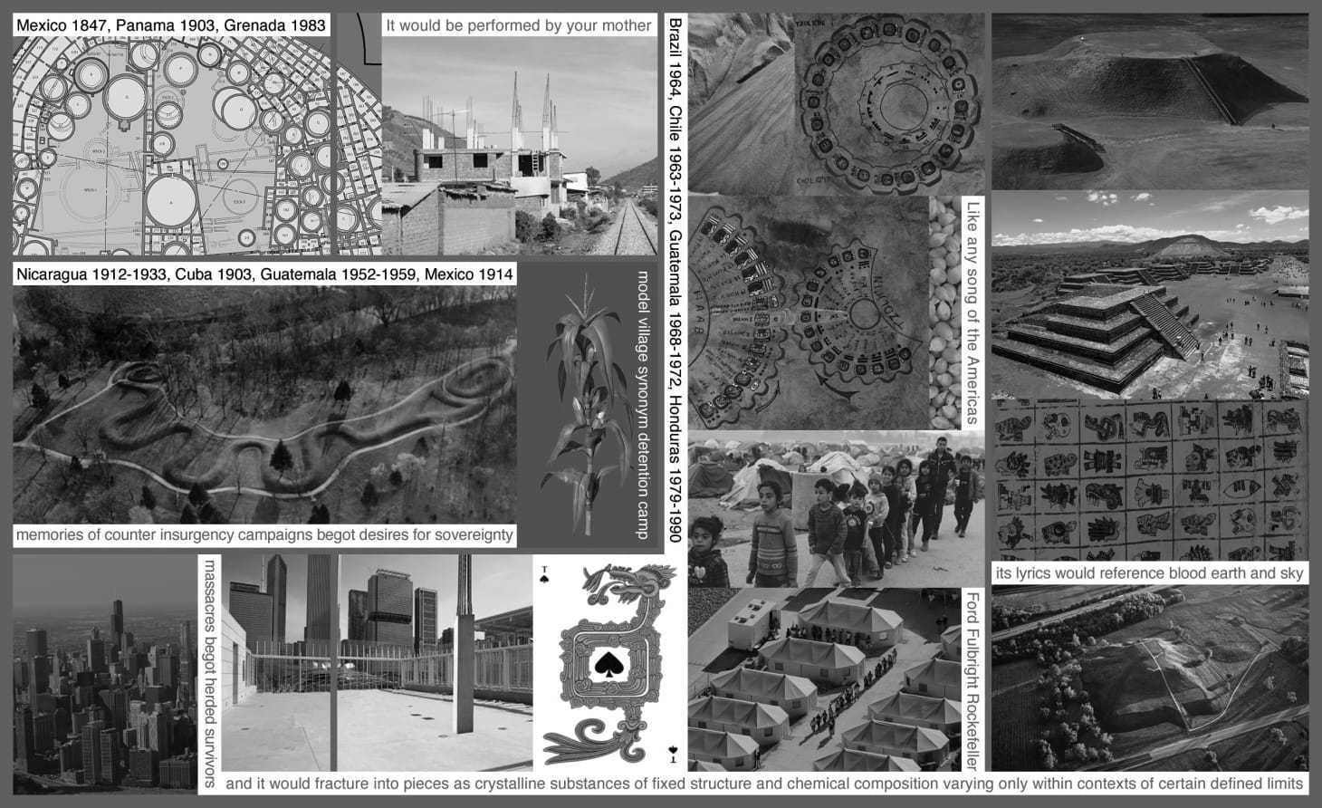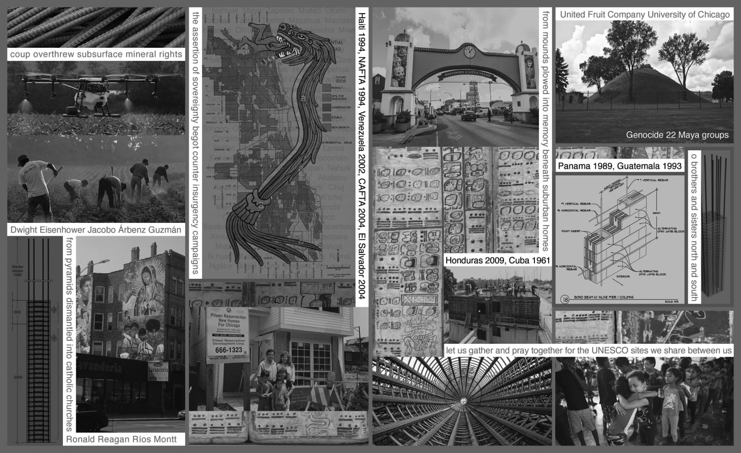 H: Accompanying the installation is a three-fold codex that is going to be published at the Art Institute of Chicago. Inside is a collage of images relating to construction, agriculture, Indigenous calendars, child detention centers, gentrifying neighborhoods in Chicago, as well as dates of US American interventions in Central and South America and lines of poetic text. What binds these references together?