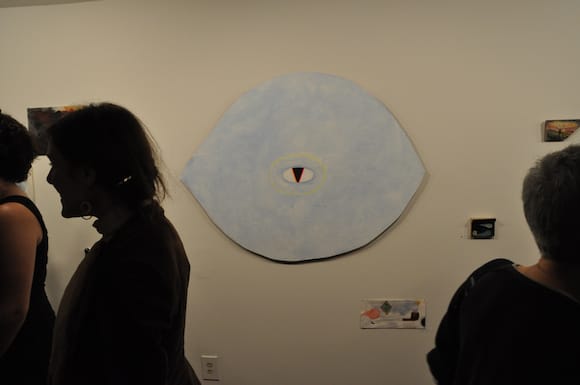 The place was crowded but the work looked fantastic. La Rocco had started to fashion his frames to suit the paintings and some bulged, others were cut, and some works were odd shapes. Olson’s work was flatter and more linear. Stripes of bright colors zigged and zagged and one giant lemony eye forms appeared again and again. One even had a ring of incense sticks sticking out of it like eyelashes. I asked him if he planned to light it but he said Janet wouldn’t let him. With good reason, it would’ve probably asphyxiated the room full of culturatti.
