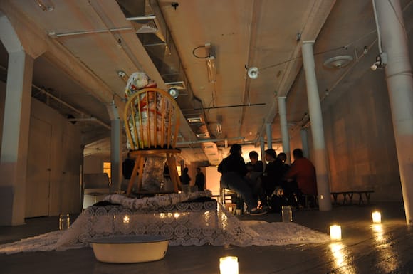 We walked into Grace and it was curiously quiet. We immediately saw artist Andrew Ohanesian and others from the English Kills Gallery crew, including Chris Harding and Peter Dobill. Ohanesian broke the news to us, “You just missed the performance.”