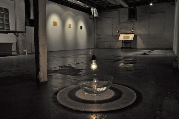 Barlett was at the space and when we arrived he was happy to see us. The place looked clean and a little solemn. Small ink drawings were placed under glass on a table, burned wood pieces hung on the wall, one large drawing was sitting on a drafting table, and another sculptural installation stretched across one wall. There was a constant trickle of people coming in to look at the art and everyone seemed receptive. Bartlett’s work was sparse and controlled. They were equal parts cerebral and emotional, no one side dominated the other. Veken and I shared a can of beer and lingered to see how the work would change. It felt a little religious, but I’m an atheist, what do I know.