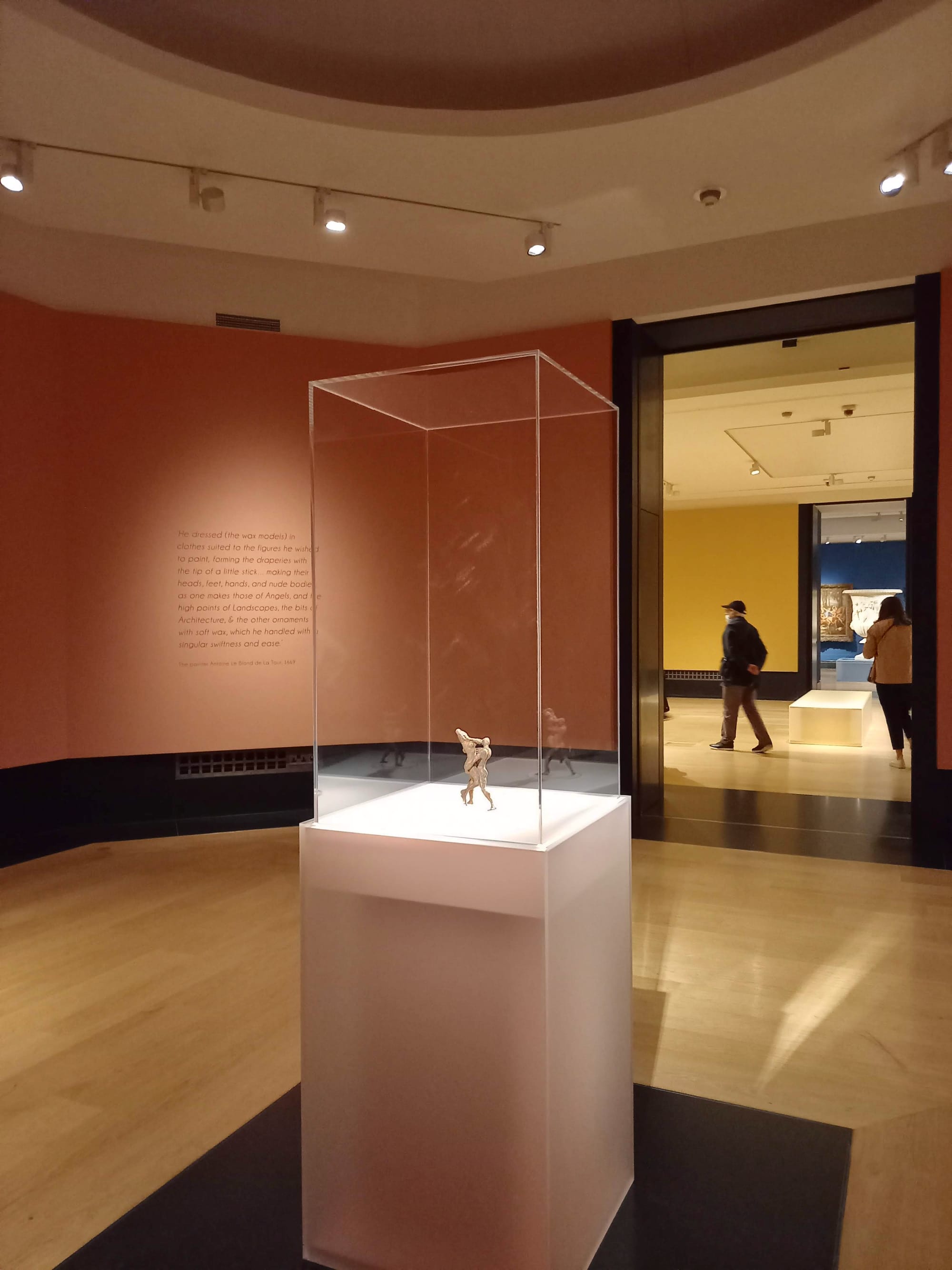 In another attempt to bring excitement to exploring Poussin’s working method, much is made of his use of wax maquettes in preparation for composing larger paintings. Given the lack of extant examples, contemporary artists Andrew Lacey and Sian Lewis have been commissioned to make wax figurines in the positions detailed in Poussin’s drawings. Presumably the artists’ impressions are intended to help bring to life this intermediary step between drawing and painting, yet it is irrelevant to art historical accuracy and feels — especially when an entire connecting room has a single wax figurine rotating in a glass cabinet — more here to fill the space.