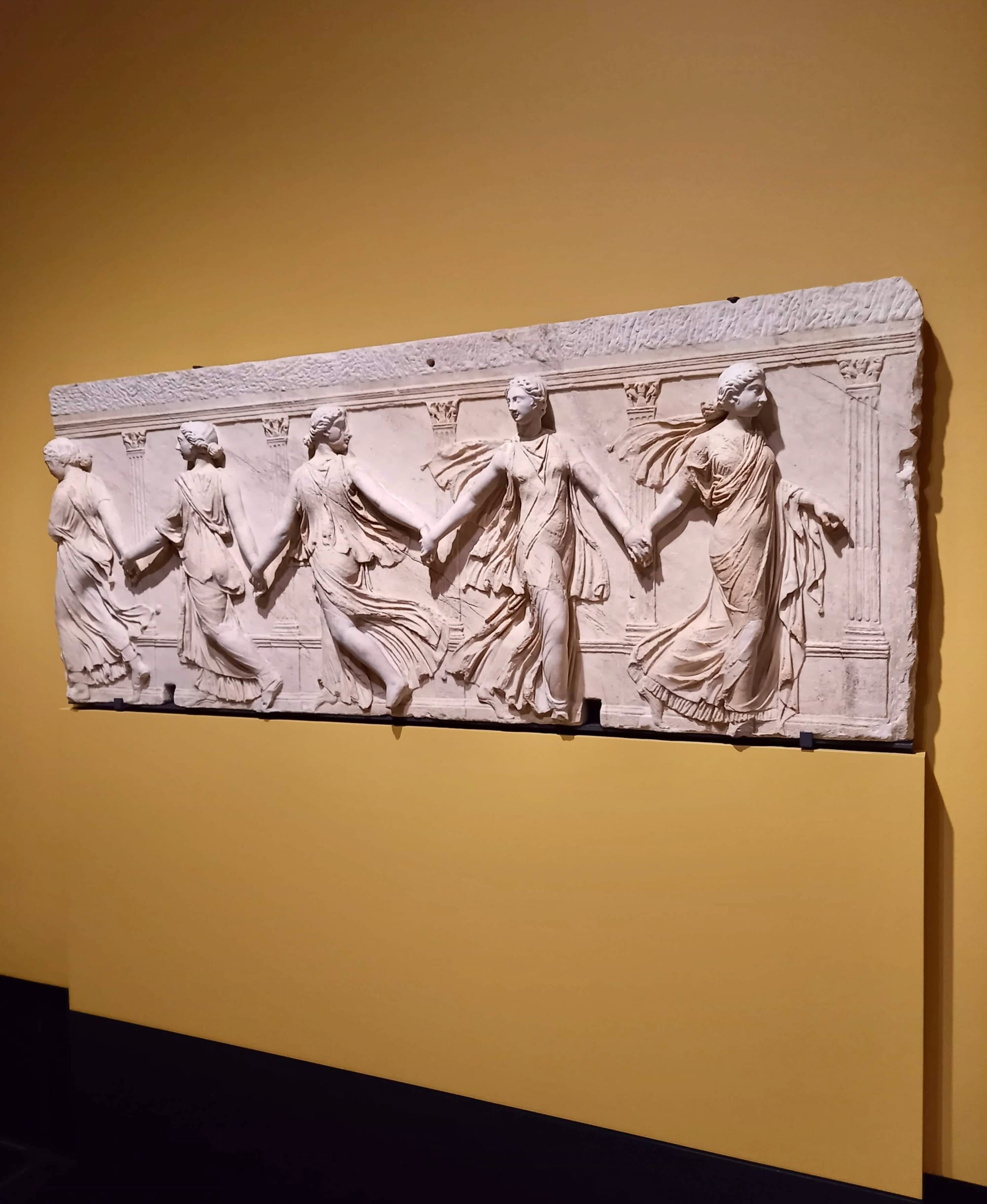Where we have a definitive source of influence present, such as the Borghese Dancers which early Poussin biographers establish that he visited repeatedly, we can clearly see both types of influence it had on his work: that of direct quotation of content and figures, and general absorption of spirit. Not only does Poussin directly quote the dancing women holding hands in a horizontal link flowing through them across the pictorial plane in his “Dance to the Music of Time,” (1634–1636) but we can also clearly see how he interpreted the rhythmic articulation of the classical frieze into a painterly format. Indeed, the dancers divide up the marble at regular intervals, simultaneously frozen in their “moving” positions, drapery billowing in patterns with a regularity that makes the composition resemble musical notation.