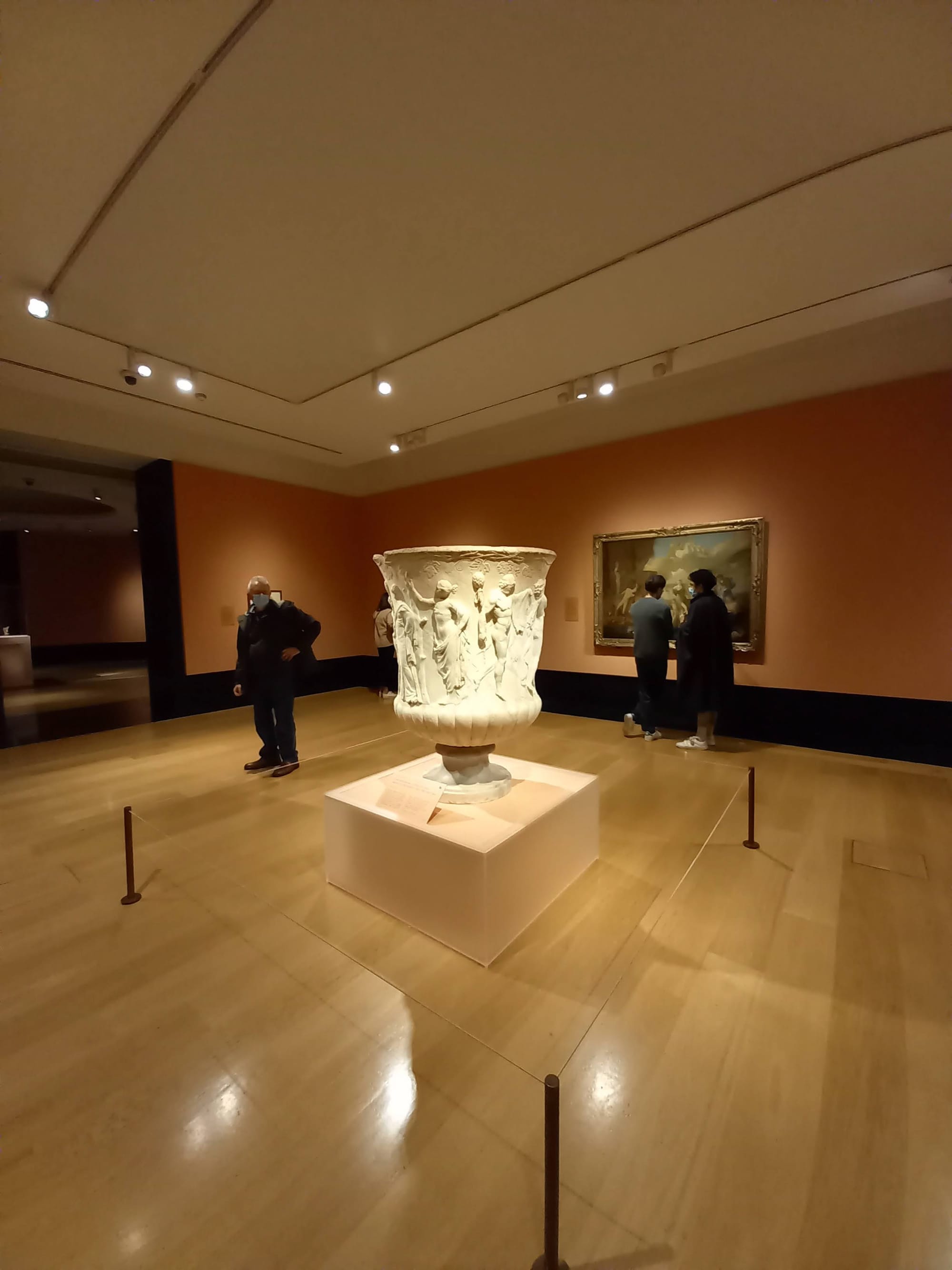An age-old issue facing curators is how to demonstrate the “influence” of one artistic source in (an)other artist(s) work. The simplest way often used in the discipline of art history is to present examples which, side by side, exhibit clear resemblance in a specific way. Harder to demonstrate is a general pictorial language absorbed and used by the artist in focus. Two enormous antique kraters, the “Gaeta Vase” (1st Century BCE) from the National Archaeological Museum in Naples and the “Borghese Vase” (1st Century BCE) from the Louvre, Paris, are present at surely enormous trouble and expense. The slippery wording of the caption for the Gaeta vase suggests a specific pictorial connection with the surrounding examples of Poussin’s work where there is none provable: “The heady celebrations on this vase had a profound impact on Poussin’s art. He may have seen it in the cathedral of Gaeta ... or studied drawings of it.”. The writer leaves deliberately unclear whether the “heady celebrations” are general ones, or those depicted on this specific vase, which we have no proof Poussin actually saw. Does that he “may” have seen it justify its being here?