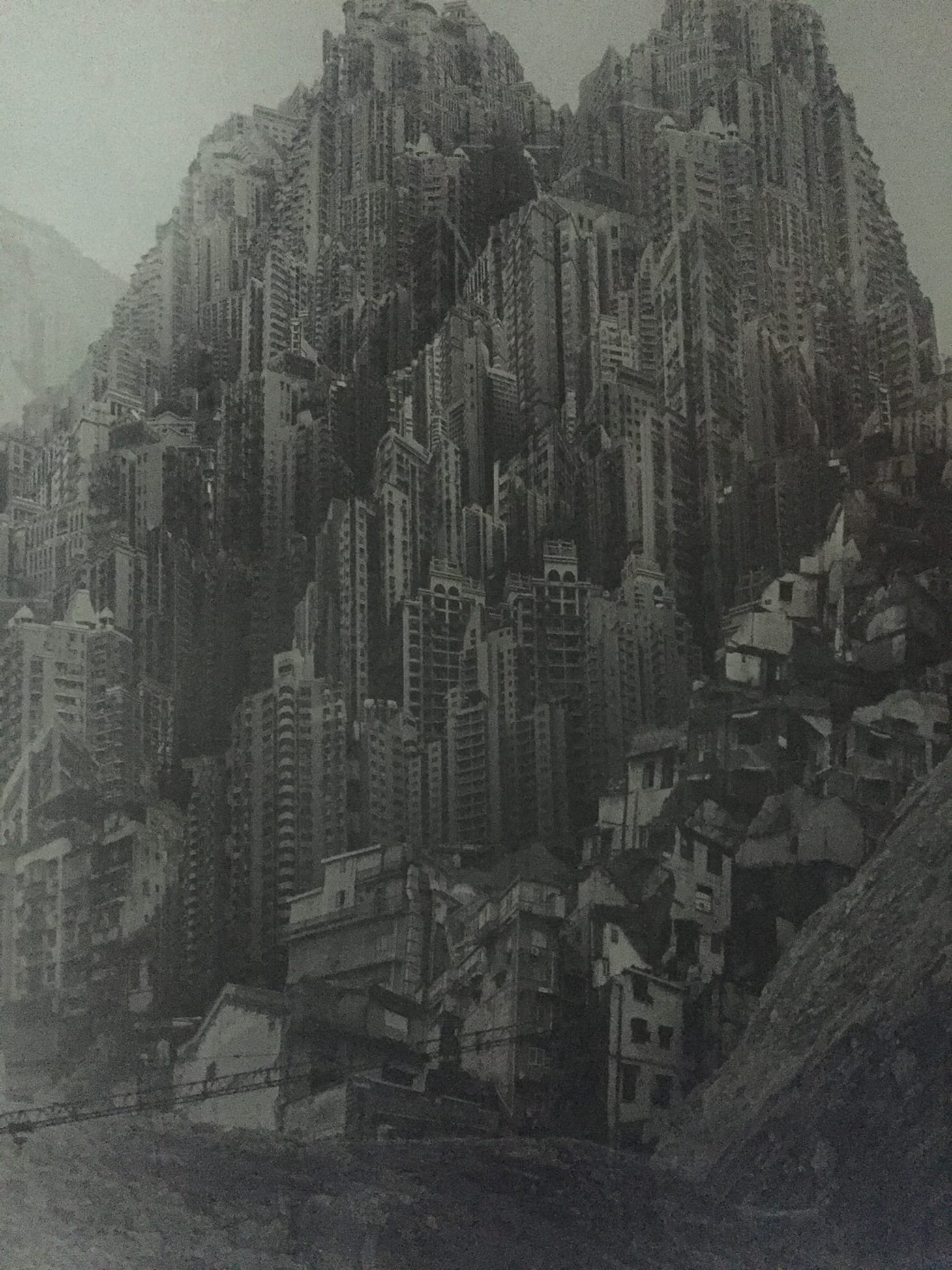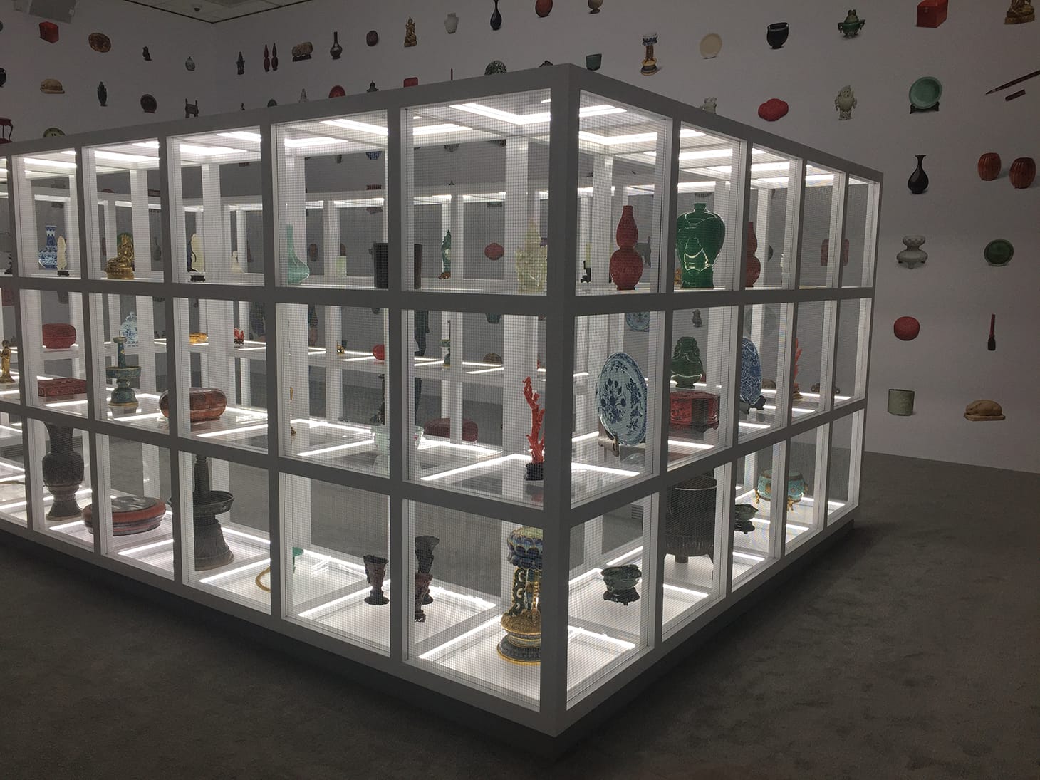 The room “Prosperity,” displays around one hundred objects from the Qing dynasty in a large fenced-in case. Gorgeous vases, decorative plates, and pristine statues of religious figures speak to the decadence and high artistry of the era. On the walls, additional images of Qing objects are displayed as wallpaper. In contrast to the first room’s barely perceptible piano music, the second room has an almost unnervingly cheerful soundtrack, filled with animal sounds, police whistles, lion roars, and whipping sounds. Our sense of time is tickled with the inclusion on the walls of a digital print by contemporary Chinese artist Yang Yongliang. Yang evokes traditional Chinese landscape paintings of mountains, that on closer look reveal mountain shapes filled with details of an urban landscape.