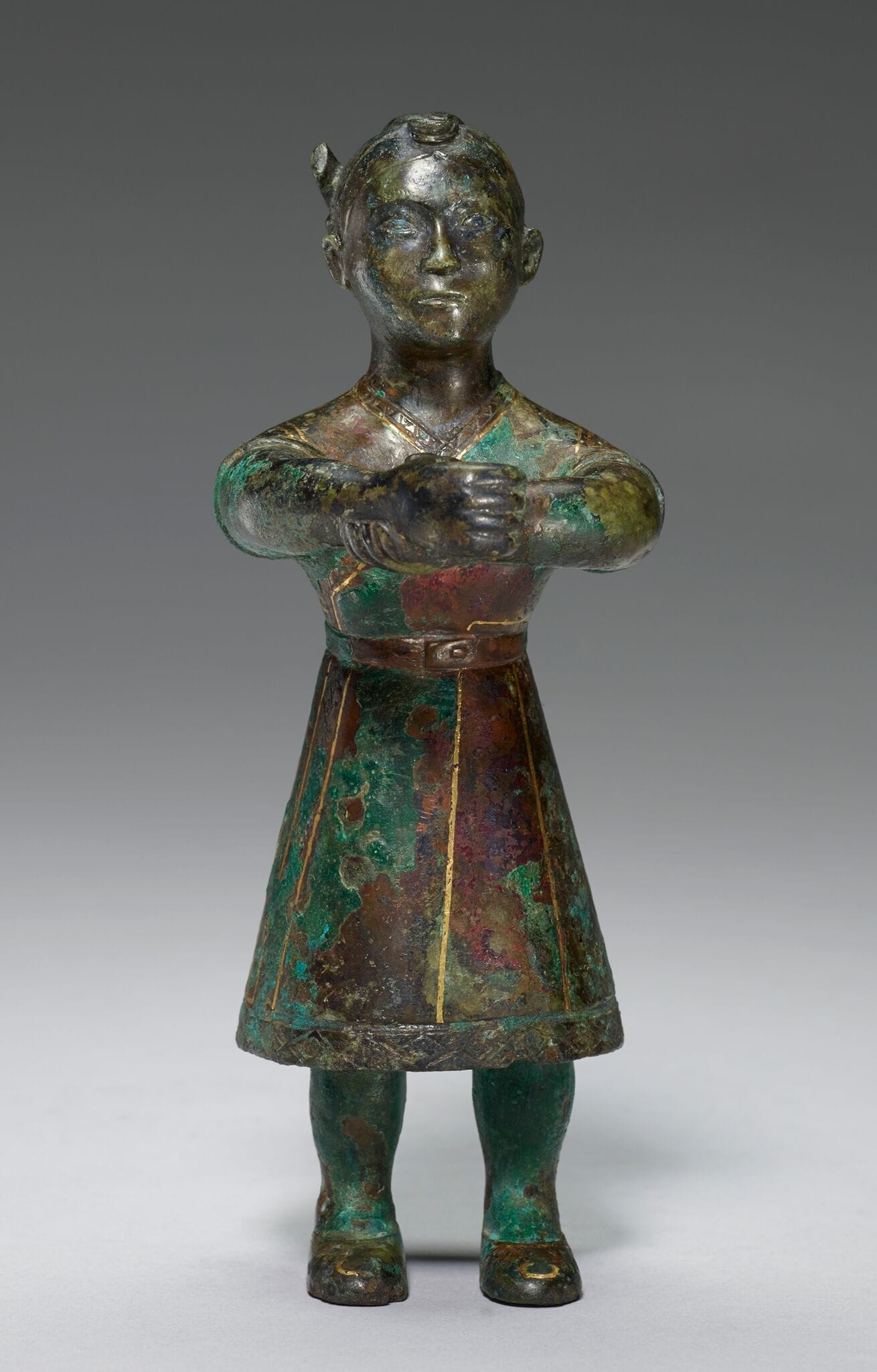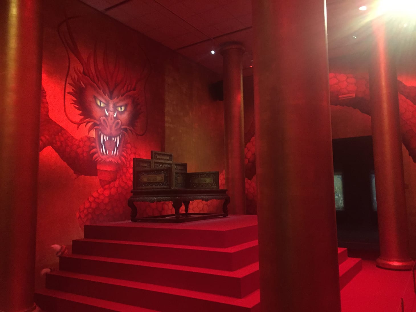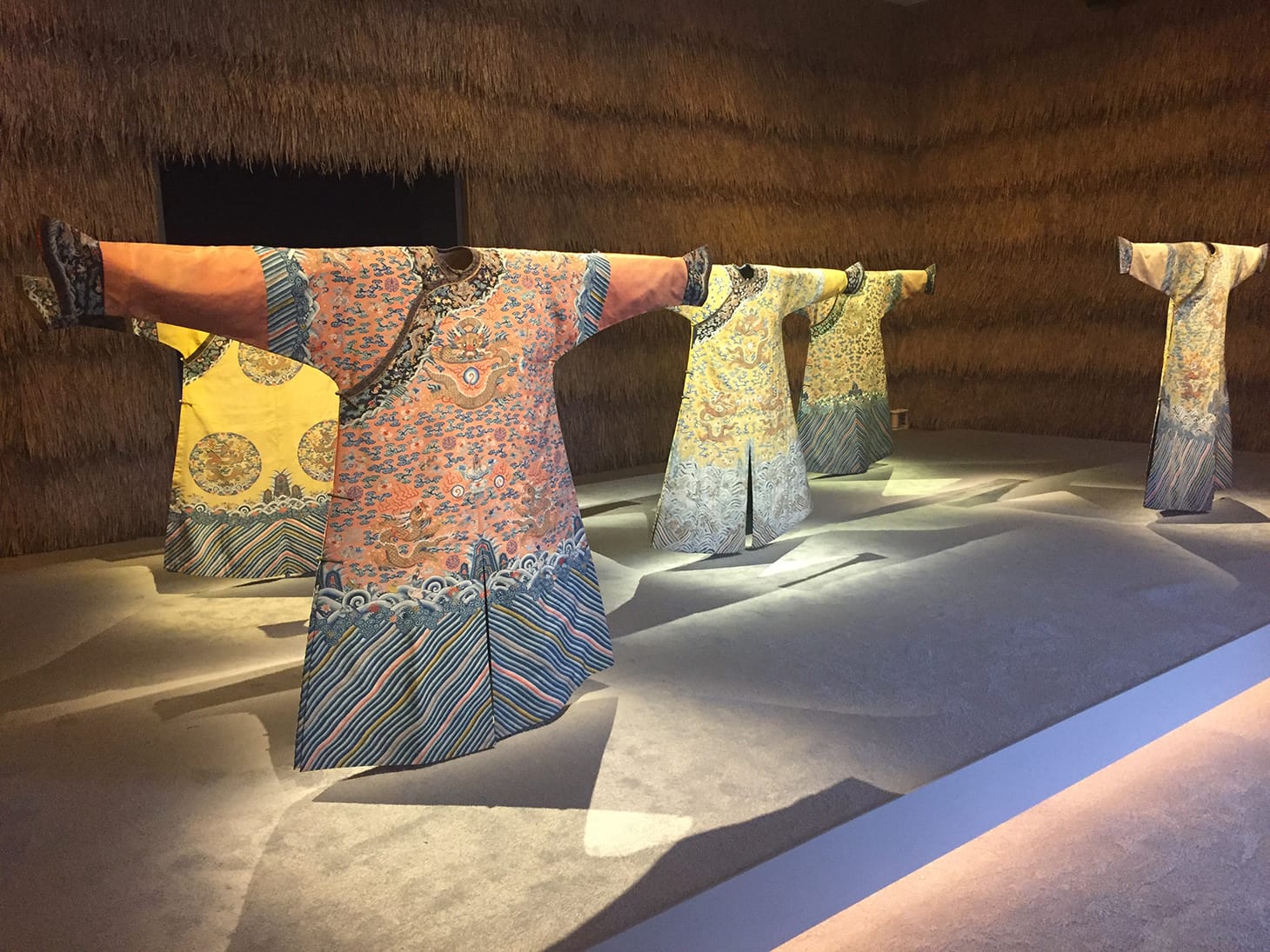 Throughout the rest of the rooms, the narrative about the Qing Dynasty unfolds with drama. In the “Order and Hierarchy” room, imperial ceremonial robes are hung stiffly, by order of rank, in contrast to walls lined with thatched hay. The “Fearsome Authority” room posts an eighteenth-century polychrome lacquered throne from the Quianlong period, while behind it a giant dragon is painted on the walls. Frankincense wafts through the space, while screeching dragon sounds can be heard intermittently between the soundscape of ceremonial music. Other rooms feature Buddhist sculptures and Daoist paintings, respectively, and there’s a “Common Man” room featuring one single standing figure in a glass case, dated to the 4th–5th century CE.