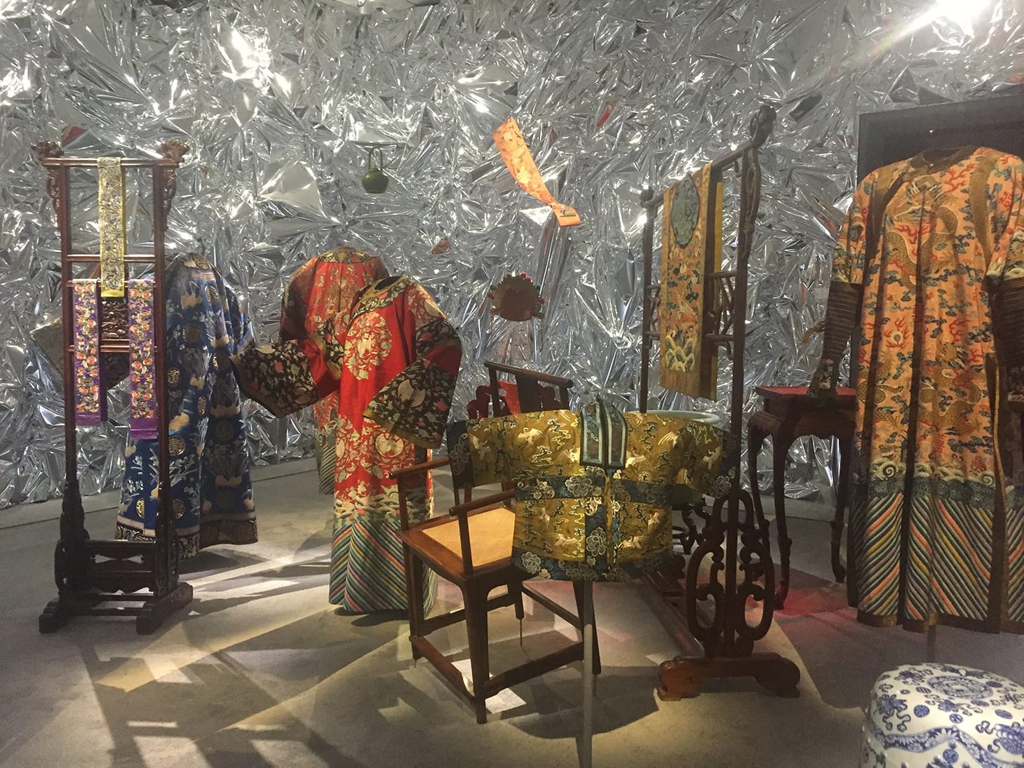 Wilson likens his role to that of an architect. “I never could curate this amazing collection properly because I don’t have the background or the knowledge,” he said. Funnily, the specificities of the Qing dynasty, which lasted from 1644–1912, a period when the arts flourished, never quite made it into the exhibition design. The period is characterized by the rise of literacy, the Confucian tenets of self-cultivation, and a prosperous economy. These traits supported numerous artistic movements during the period, where decadent court costumes made of fine embroideries, magnificent paintings, sculptures, ceramic works, and glassware were enjoyed by the elites. While the historical information and context was not clearly laid out in the show, the material quality of the period was amplified. “I provided a megastructure,” resounded Wilson. “I know something about the light, I know something about the material of the room, the smell of the room, I can work with other people— curators, to make decisions as to what the place is.”