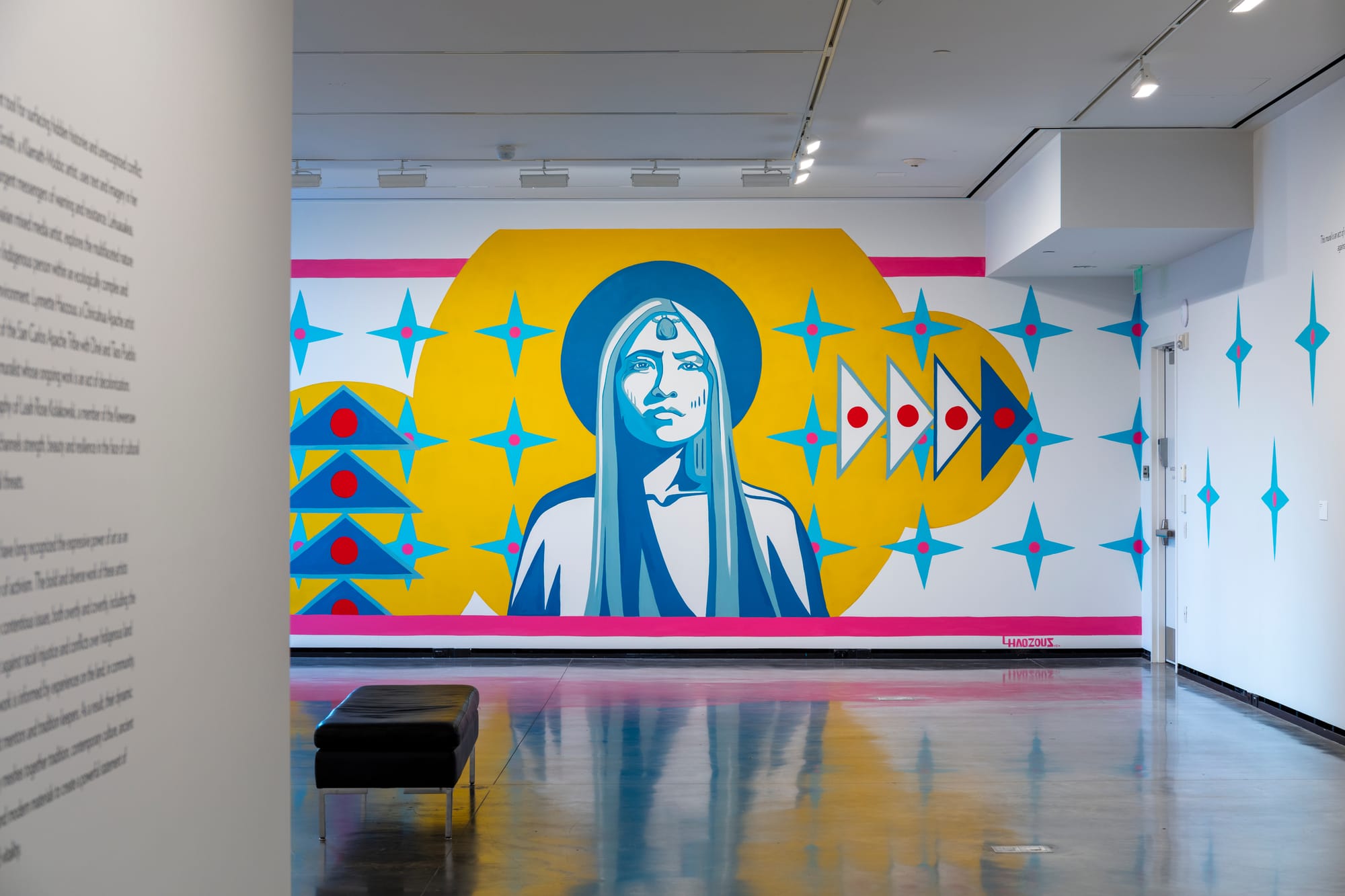 PORTLAND, Oregon — Outside a fourth-floor window in the Portland Art Museum, rain-darkened tree branches dotted with crows make a latticed silhouette against a mottled gray sky. In bright contrast, a 22-foot mural illuminates a room of the modern and contemporary art wing, alive with its own light and vivid planes of saturated color: pollen yellow, turquoise, blossom pink, pulsing red. Created by Lynnette Haozous, an artist and social worker based in Albuquerque, "Into the Sun" (2021) shows an Apache woman who stares with an unwavering gaze during the sunrise ceremony, which marks the transition into womanhood. “This mural is an act of rematriation,” Haozous says, her words emblazoned on the gallery wall. “It is an act of resistance against the patriarchal systems that have tried to control Indigenous existence and resistance.”