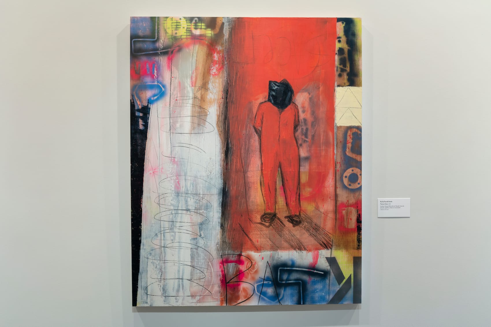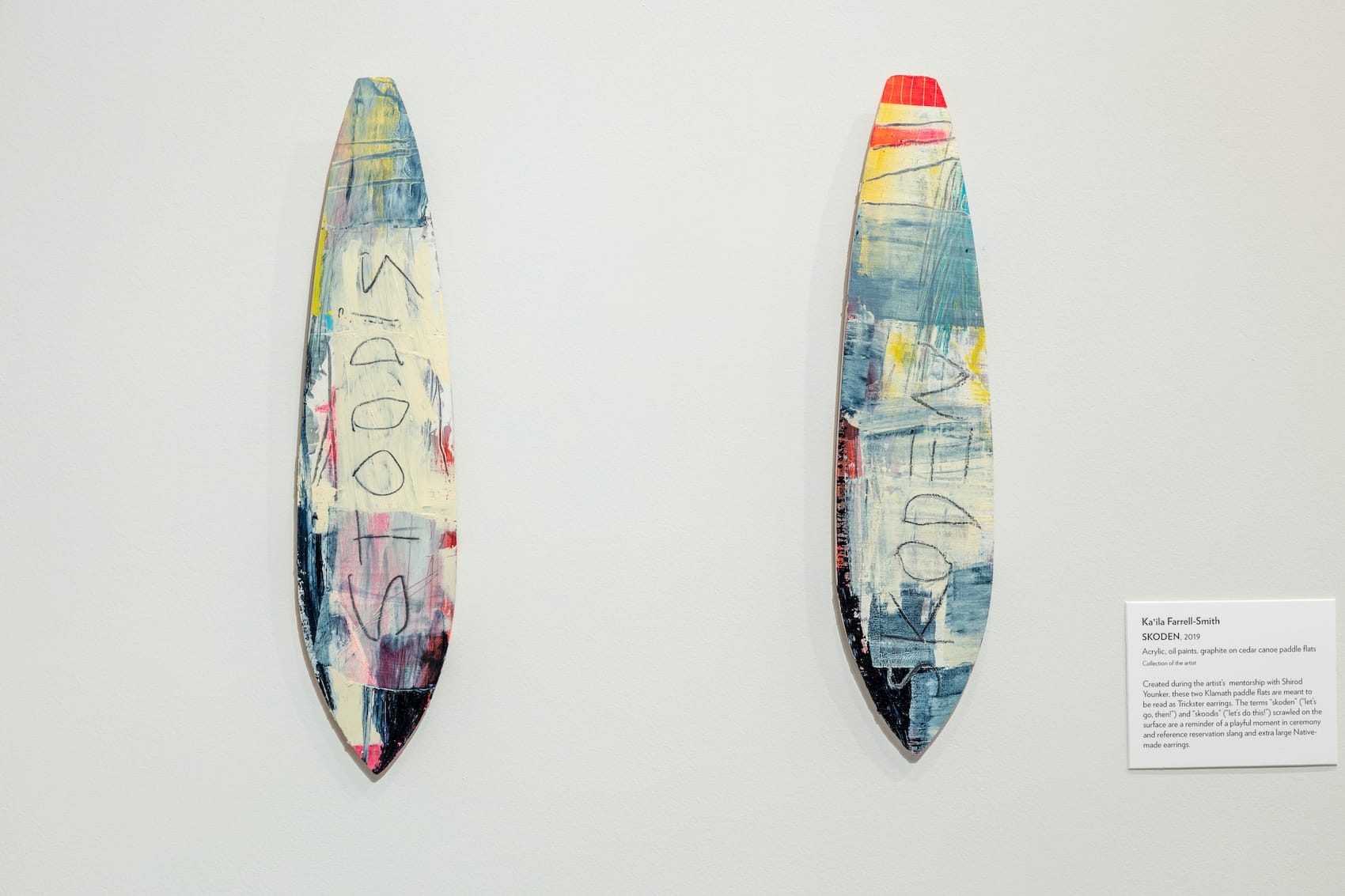 Installed on the walls flanking Haozous’s mural are eight works by Ka’ila Farrell-Smith, who lives in Modoc Point, Oregon. Her expressive mixed-media paintings buzz with frenetic scratch-scrawl marks, as well as handwritten notes and layers of stenciled shapes and letters, smears of acrylic, smudges of pigments, ghostly imagery, a haze of aerosol paints. A case near the paintings holds hunks of earth pigments and objects the artist collected on Klamath lands and used as stencils in her Land Back series. In “Missing Her: No Man Camps” (2019), the letters LNG (the abbreviation for “liquefied natural gas,” or fracked gas) are circled and crossed out, a reference to her fierce opposition to Jordan Cove Energy Project’s proposed — and since cancelled — pipeline, which would have run through hundreds waterways and her tribe’s traditional sacred lands.