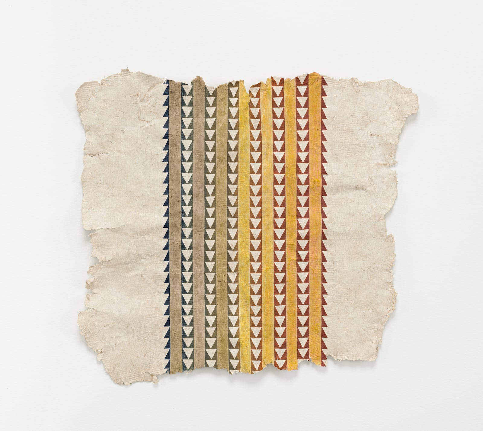 The final section of the show features five works by Lehuauakea, a Native Hawaiian artist living in Seattle and, at 26, the youngest in the show’s line-up. Their work centers on kapa, a cloth handmade from mulberry fiber that’s used in Native Hawaiian practices and rituals, from birth to death. "Mele o Nā Kaukani Wai (Song of a Thousand Waters)" (2018), a roughly 11 by 8-foot work made from swathes of kapa that have been stitched together and painted and stamped with traditional patterns in plant dyes and mineral pigments, drapes the expanse of one wall. Its surface forms a mountainous terrain, like an animal hide or a map that traces mythologies and storylines through lifetimes. This centerpiece also served as Lehuauakea's thesis project at art school, propelling them through graduation and into life as a practicing artist.