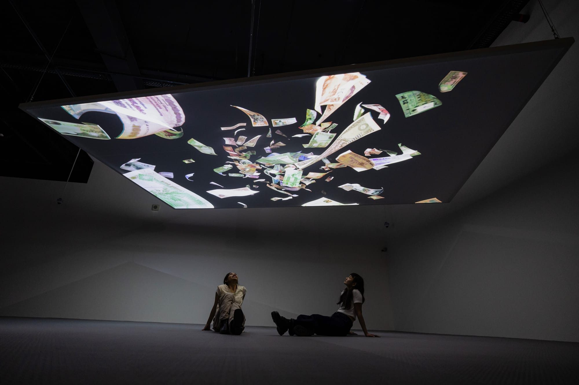 One enters the exhibition in darkness, drawn to a rhythmic dance of light in the back corner, emanating from a screen that drops from the ceiling. As one walks closer, the carpet floor gradually slopes upward, and shards of color crystallize into money, in varying currencies and denominations. Cross-hatched portraits of George Washington, Ho Chi Minh, Queen Elizabeth II, and Mao Zedong crowd the screen, swarming past and phasing through each other. “Undrift” (2024) takes turns on the screen with “Untitled (Singapore)” (2014), in which a single Singaporean fighter jet appears parked in the blue skies above Udon Thani, Thailand. This work alludes to Singapore’s 2005 exchange of seven fighter jets for rights to Thai airspace. Together, “Undrift” and “Untitled (Singapore)” intertwine money and politics as a rumination on power.