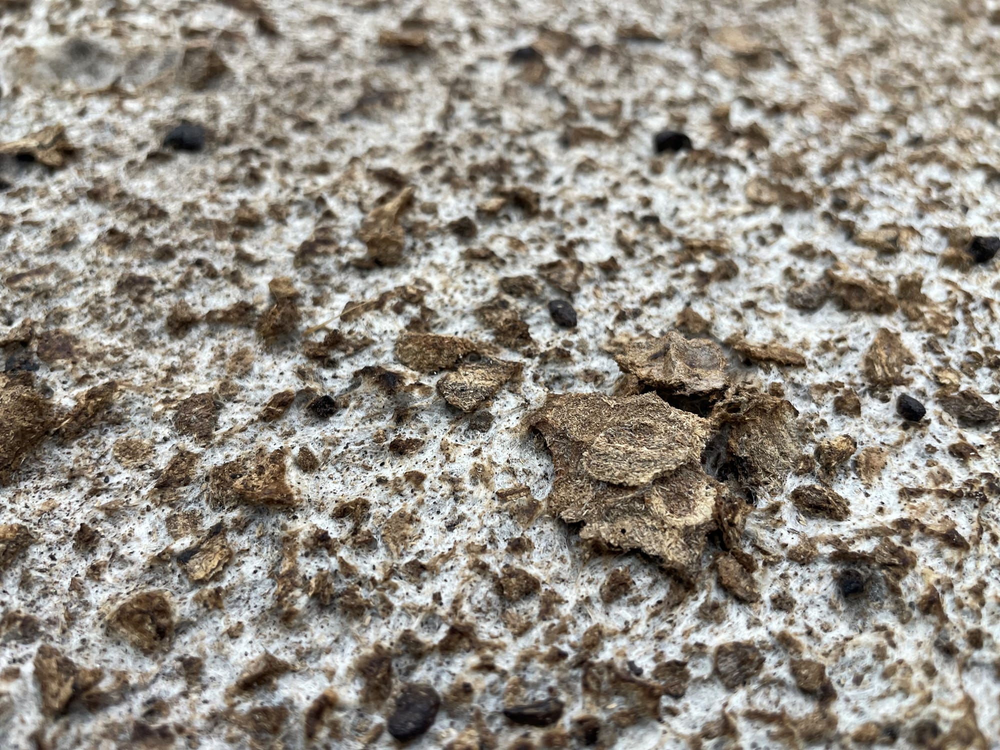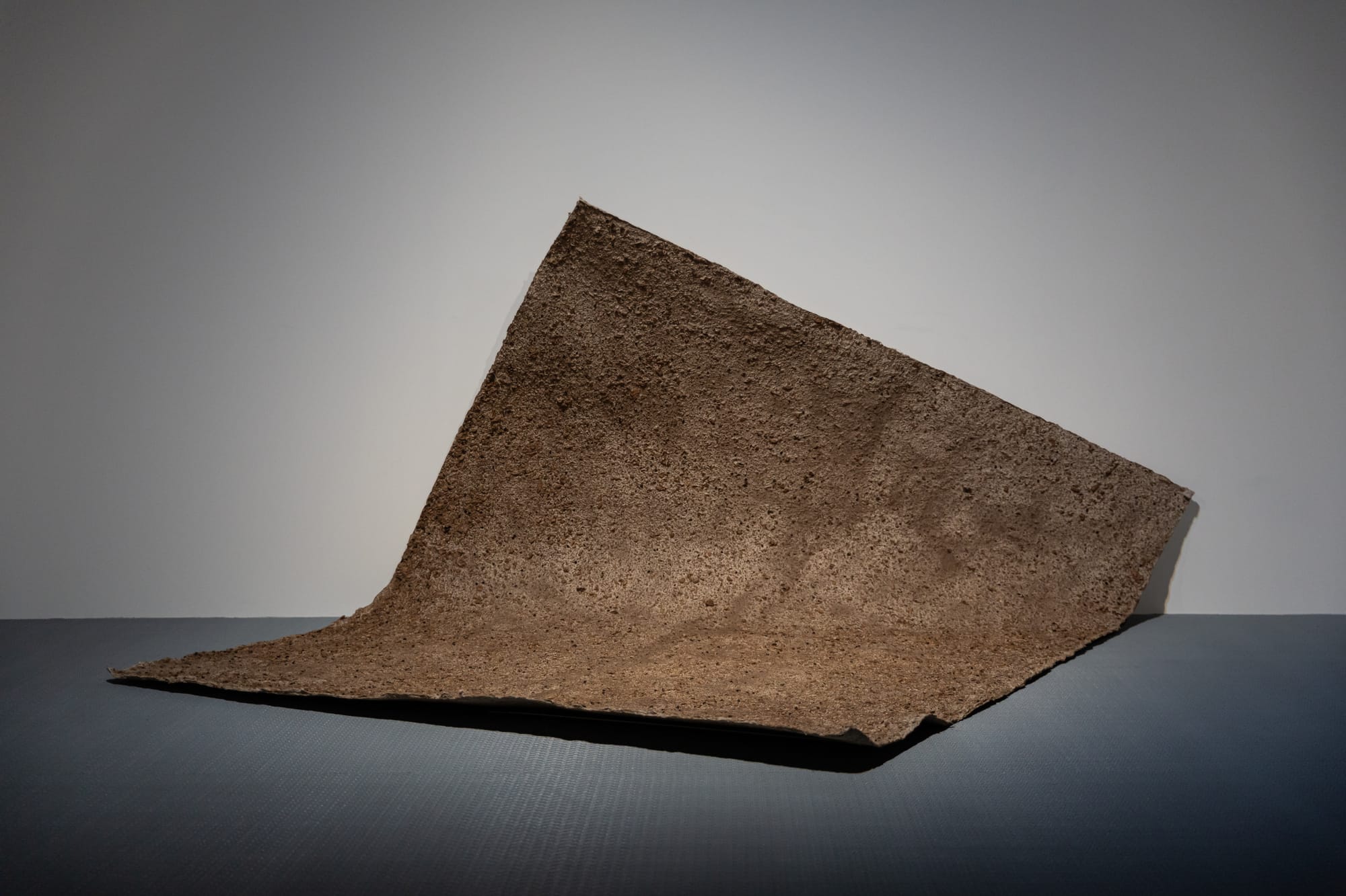 “Sacrifice depth for breadth” (2023) is perhaps the most open-ended, and thus generative, of the works in the exhibition. Leaned against and curling out from the wall, it looks like a carpet of earth, embedded with woodchips, insect wings, and other detritus. It suggests a topography, with darker paths suggesting desire lines. Next to the work is a small QR code that links to a YouTube playlist of recordings of the inside of a hornet’s nest. In Thailand, it is good luck when hornets nest in your home. “Usually, people will slice a nest open to explore its insides,” Phinthong said in an interview, “but that voyeuristic impulse feels destructive to me. Oftentimes, our desire to consume things leads to their demise.” The work accordingly takes the form of a piece of handmade paper made partly from an abandoned hornet’s nest. Phinthong's admiring exploration of the nest's textures and inner structure is gentle and odd at the same time.