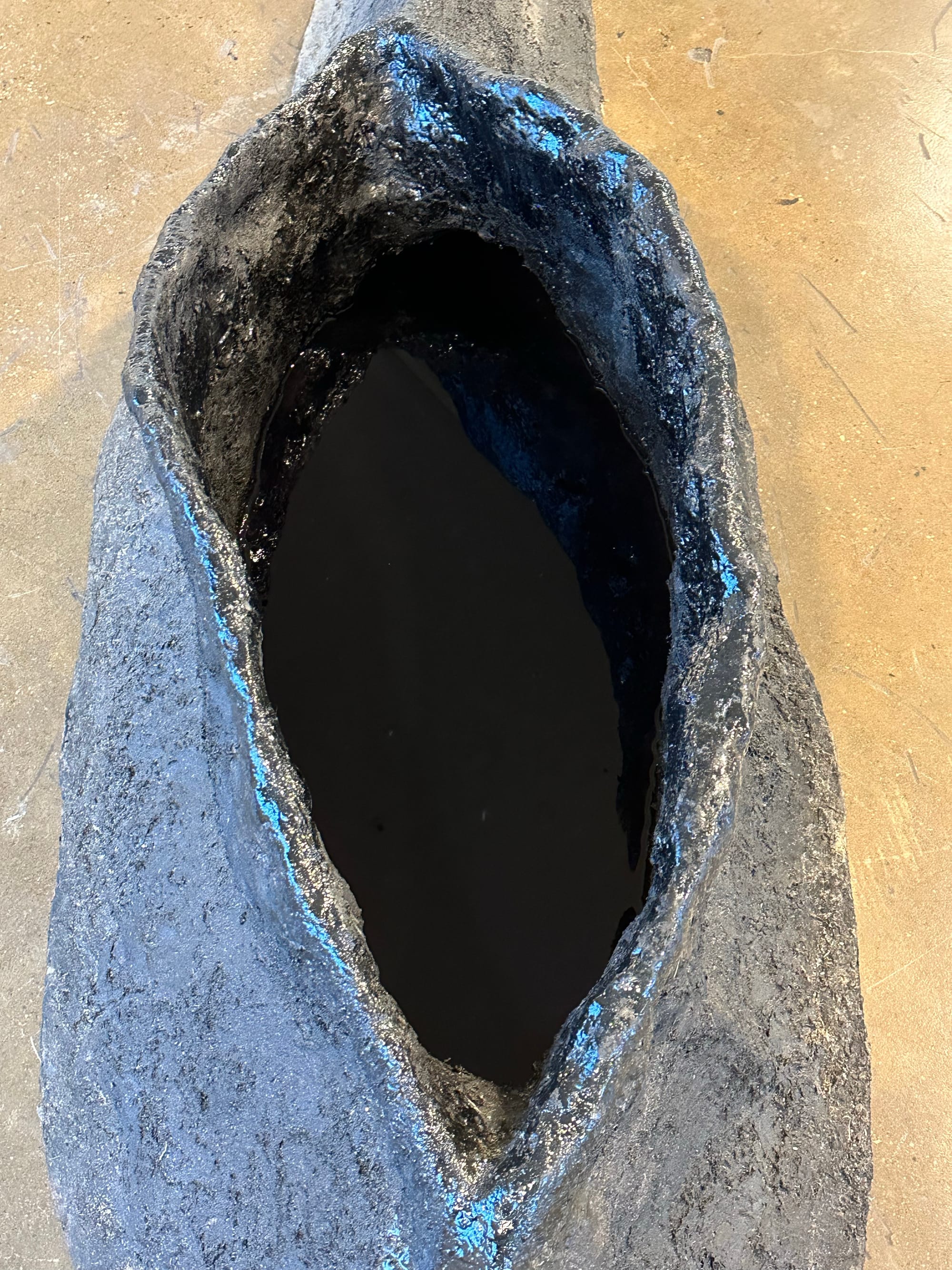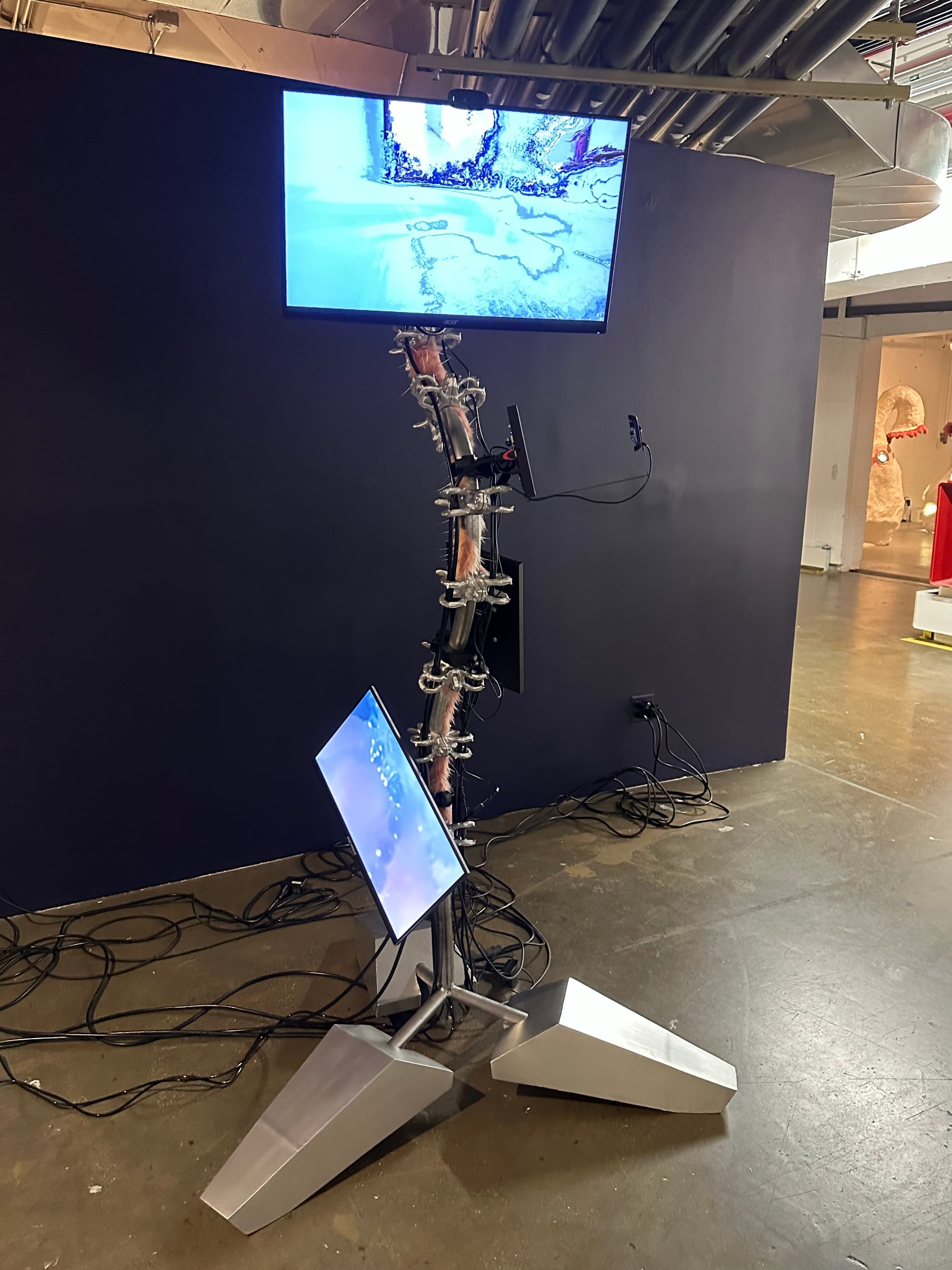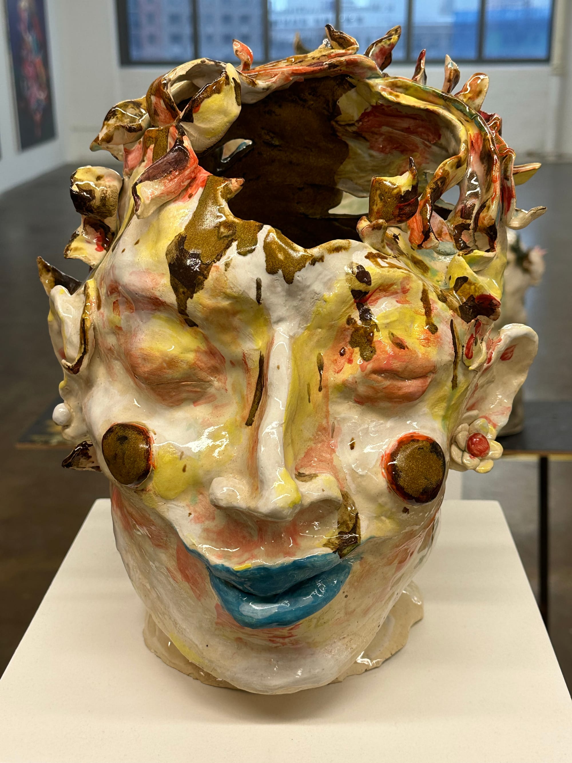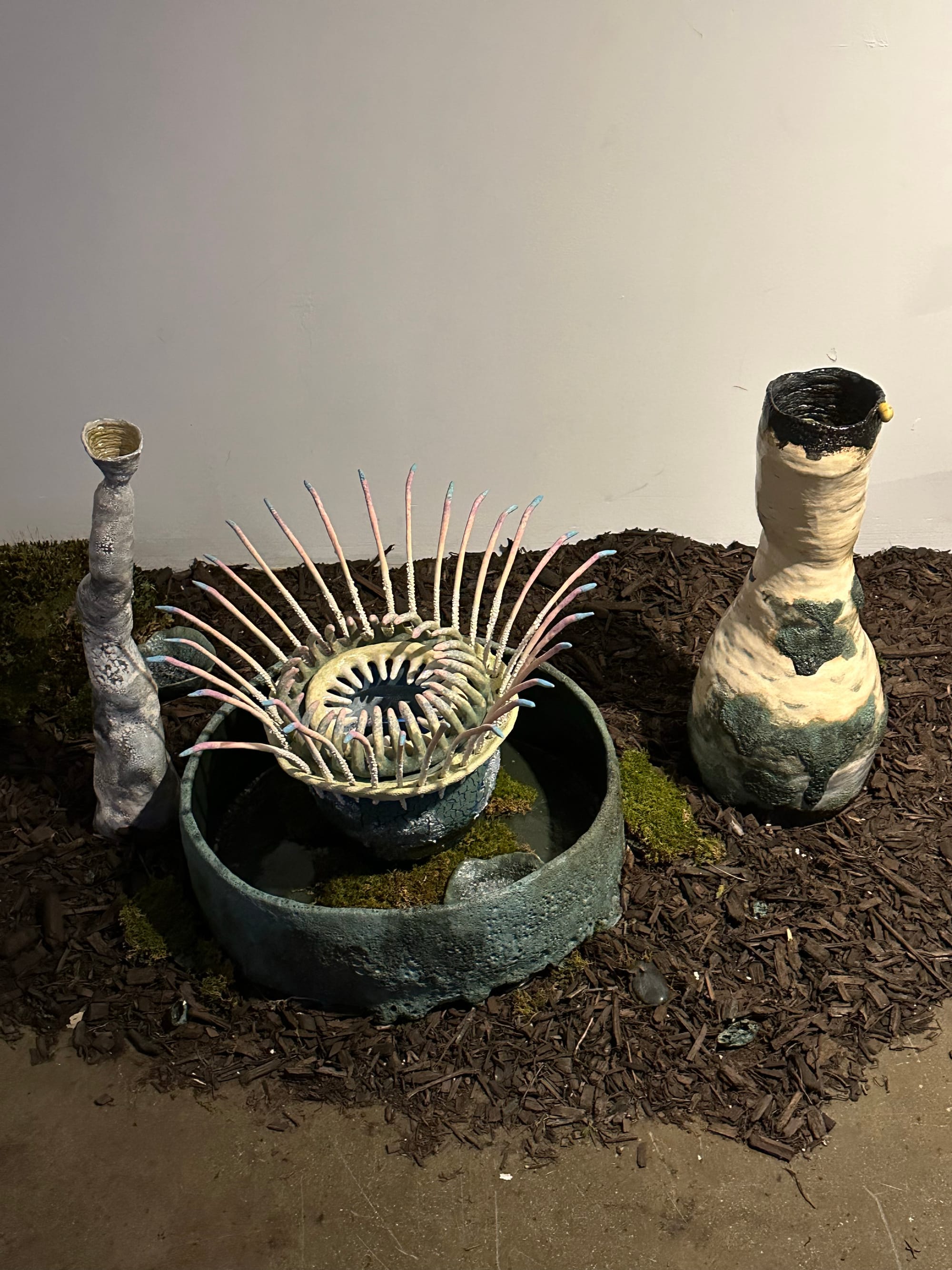 Kiarashi transformed a closet into an exhibition niche, layering mulch on the floor and enhancing the atmosphere with an eerie soundtrack. A tiny video is visible in the mouth of an unidentifiable ceramic creature with many tentacles. The video reveals another monster within the larger monster, while the tentacles are a metaphor for the complexity of dealing with our feelings, particularly at this time. As the artist stated, “it was not easy to make art in 2023.”