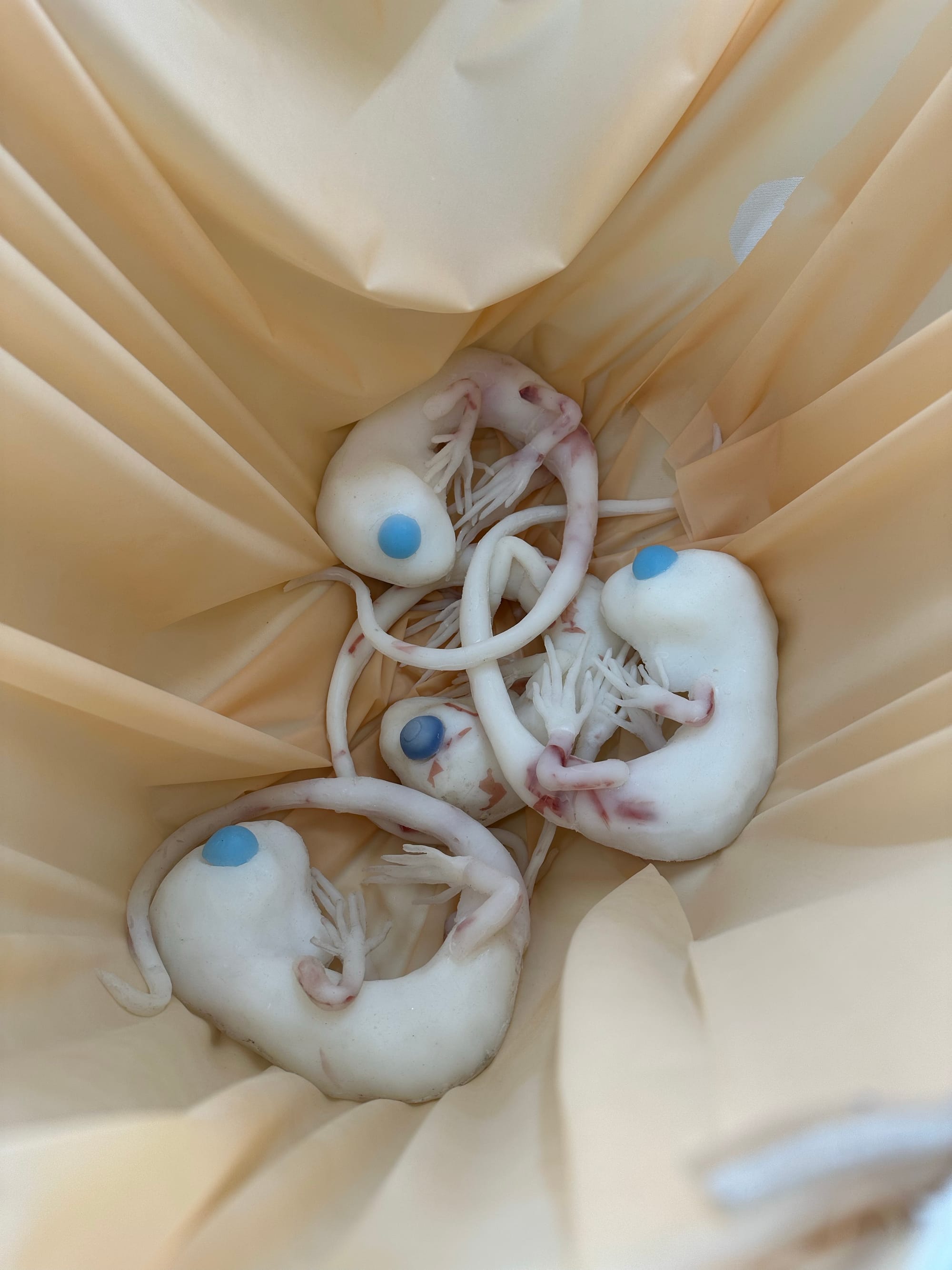 In a separate room, Michelle Frick presents several “creature” sculptures. An undulating soundtrack of swishing water envelops the space. Something is growing inside each creature — for instance, salamander embryos made out of cast silicone are visible within “Protected” (2022). In an exhibition with so many metaphors for the messes our planet is in, it’s good to be reminded that gestation is also a messy process. The artist addresses climate change through salamanders, a sensitive indicator species. Yet, sadly, global polluters are getting in the way of gestating the next generation of the animals.
