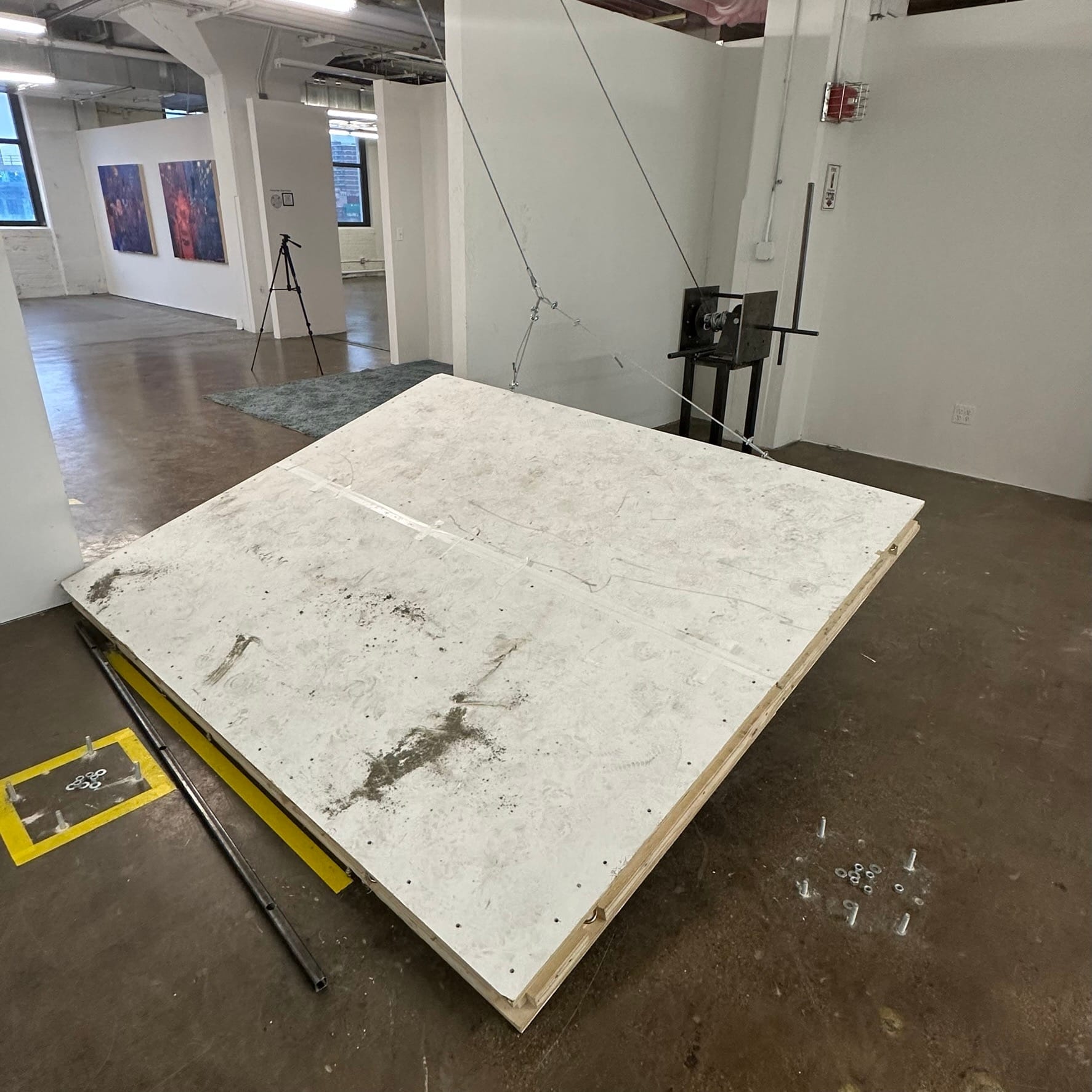 Throughout the course of the show, Cameron Burgoyne has been “activating” the space containing his artworks. Or, rather, wrecking his own works. What viewers are left with is the chaos of dust, paint splatters, and materials strewn about the space.