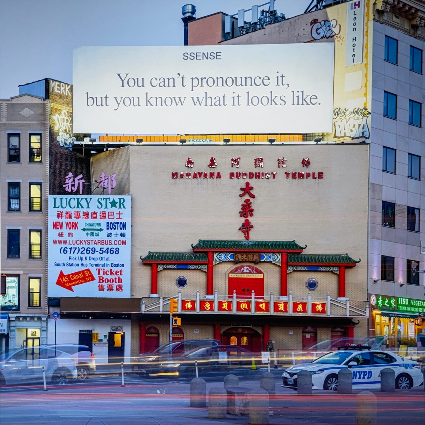 When Ethan Li saw a cringe-inducing billboard in New York's Chinatown in 2023, he knew he had to respond. The Montreal-based retailer SSENSE placed a billboard that read "You can’t pronounce it, but you know what it looks like" above a Chinese Buddhist temple. Li hired another photographer to take the picture to make a point about commercialism in Chinatown. “My work is about capitalism. I wanted to pay someone to do it,” he explained to Hyperallergic. In the era of #StopAsianHate, the photograph sums up the toxic cocktail of racism, gentrification, and capitalism that perpetuates harm and marginalization.