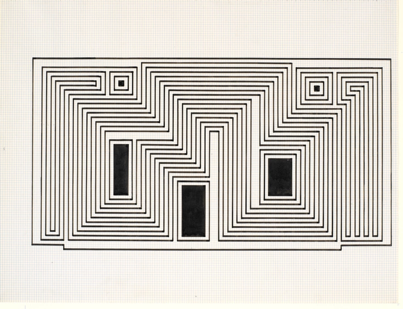 It’s clear from the photographs that Albers was inspired more by the pre-Columbian impulse toward abstraction than by any historical or religious context. Geometric façades and steep, sloping steps draw his attention, reappearing in myriad forms in his paintings. His admiration for the pre-Columbian engineer is palpable at every turn. In “Study for Sanctuary” (1941–1942), dizzying lines mirror the layout of a Zapotec or Mayan city, where the locations and distribution of buildings often performed both aesthetic and astrological functions.