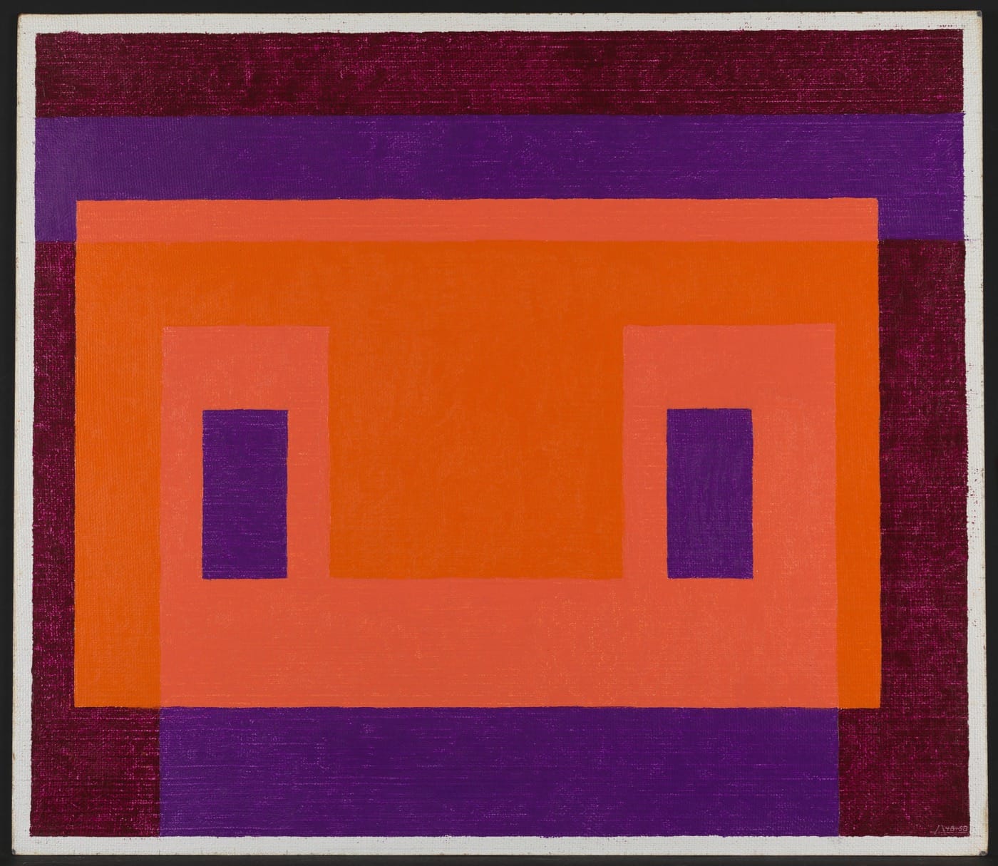 Other paintings take their cue from the contemporary landscape and built environment of Mexico, most fruitfully in his Variant/Adobe series. Inspired by the shape and colors of Oaxacan houses, Albers produced paintings of three or four radiant colors — shades of blues, purples, oranges — resembling their bright walls and shutterless windows. A photographic array titled “Architecture in Oaxaca” (1935–1967) shows Albers trying out different angles and details for this series, searching out how best to capture the concentric squares that continually captivated his attention.