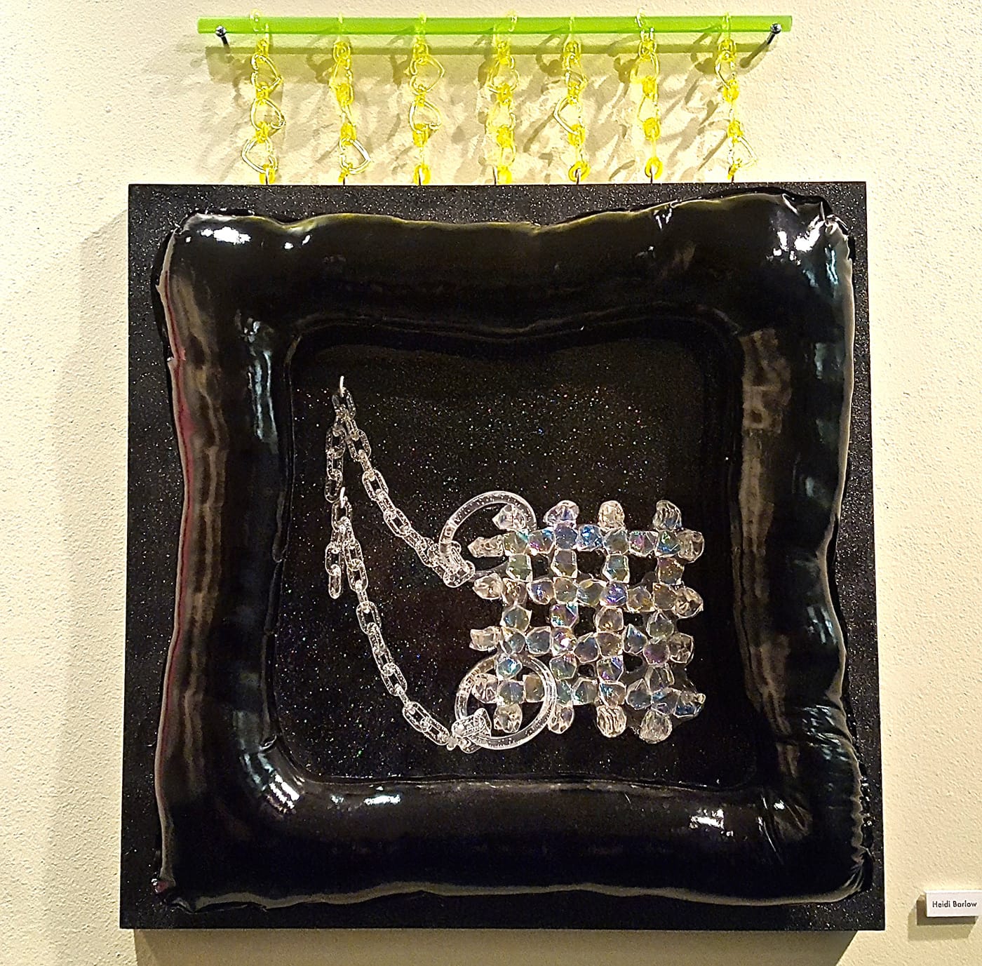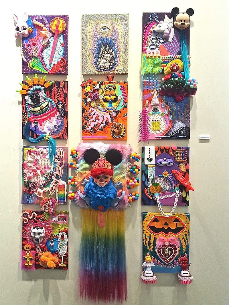 Barlow and Kasztelan both create 2D/3D compositions through the reconfiguration of cheap, readymade materials. Kasztelan’s works are more figurative-narrative (albeit psychedelically so), often leveraging the pop culture cache of her materials as a symbolic language, while Barlow uncannily provokes an emotional reaction in the viewer through her formal arrangements of informal materials and texture-on-texture-on-texture. Both embrace colorful palettes and an artificial, even chemical finish in their works (and in their process — ventilation, girls! Ventilation!!).