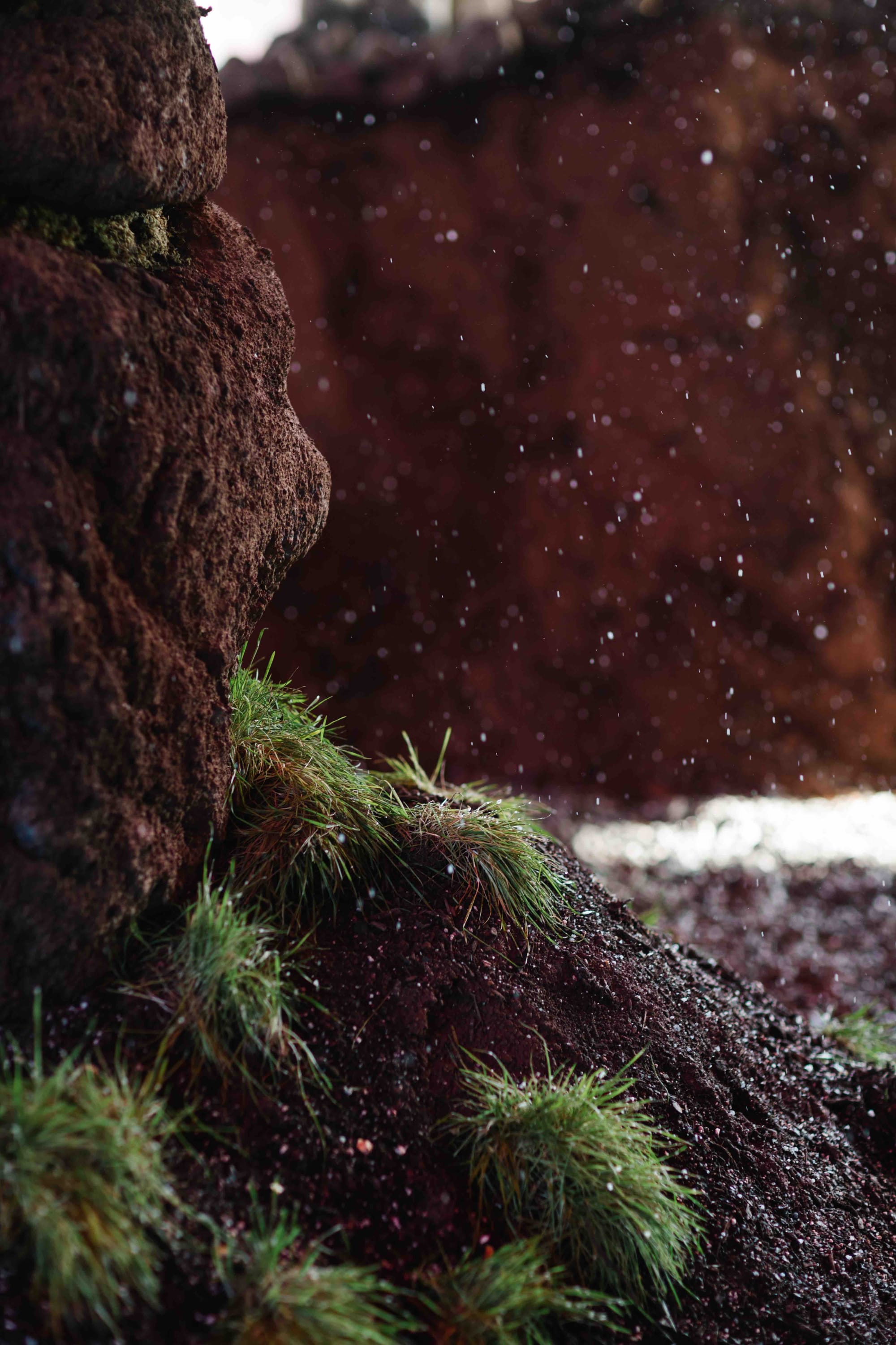 Upon entering the installation, visitors are greeted by a symphony of textures that call upon us to inhabit them. Gravel crunches underfoot as we move between stoic rock structures that punctuate the space. A haunting soundscape washes the gallery in the sounds of the ocean and the wind; alongside it, the low murmur of a stream as it trickles across the room suggests rituals of cleansing or rebirth. Wet ash falls from the ceiling like snow, nurturing the moss and soil below. The ash is made from incinerated kudzu, a plant that was deployed in the decades following slavery to protect Southern land from the soil erosion caused by cotton planting. Like the ashes of the deceased scattered in the soil, water, and air, the kudzu melts into our surroundings, joining an unending burial ritual that cycles between past and present, between slavery and its afterlives. Wrapped in the textures of Okoyomon’s installation, I am reminded that “the weather is the totality of our environments; the weather is the total climate; and that climate is anti-Black,” as Christina Sharpe writes.