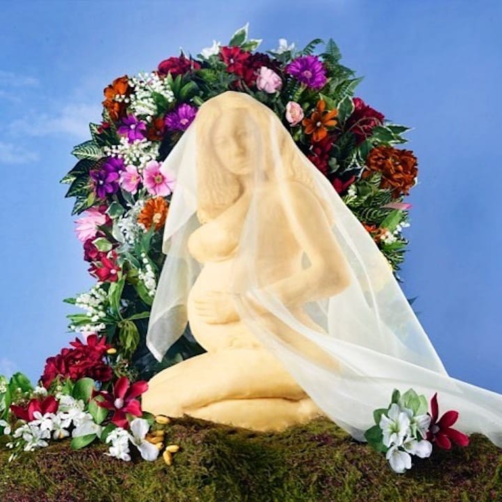 In queso you forgot, halloumi to recap: this is a fromage homage to Awol Erizku’s portrait of Beyoncé as a sort of Renaissance Madonna, in which she’s veiled, backed by flowers, and touching her very prominent bump. Bradley’s sharp sculpture is edam gouda rendition, although Cheese Bey doesn’t look nearly as confident, with an air of slight Swiss-picion.