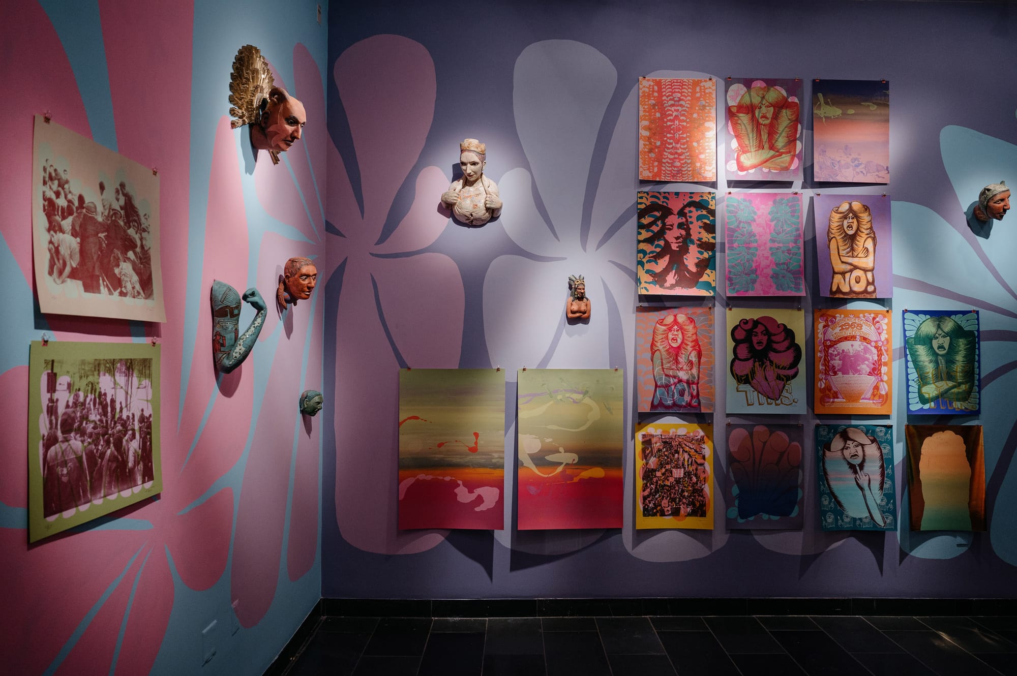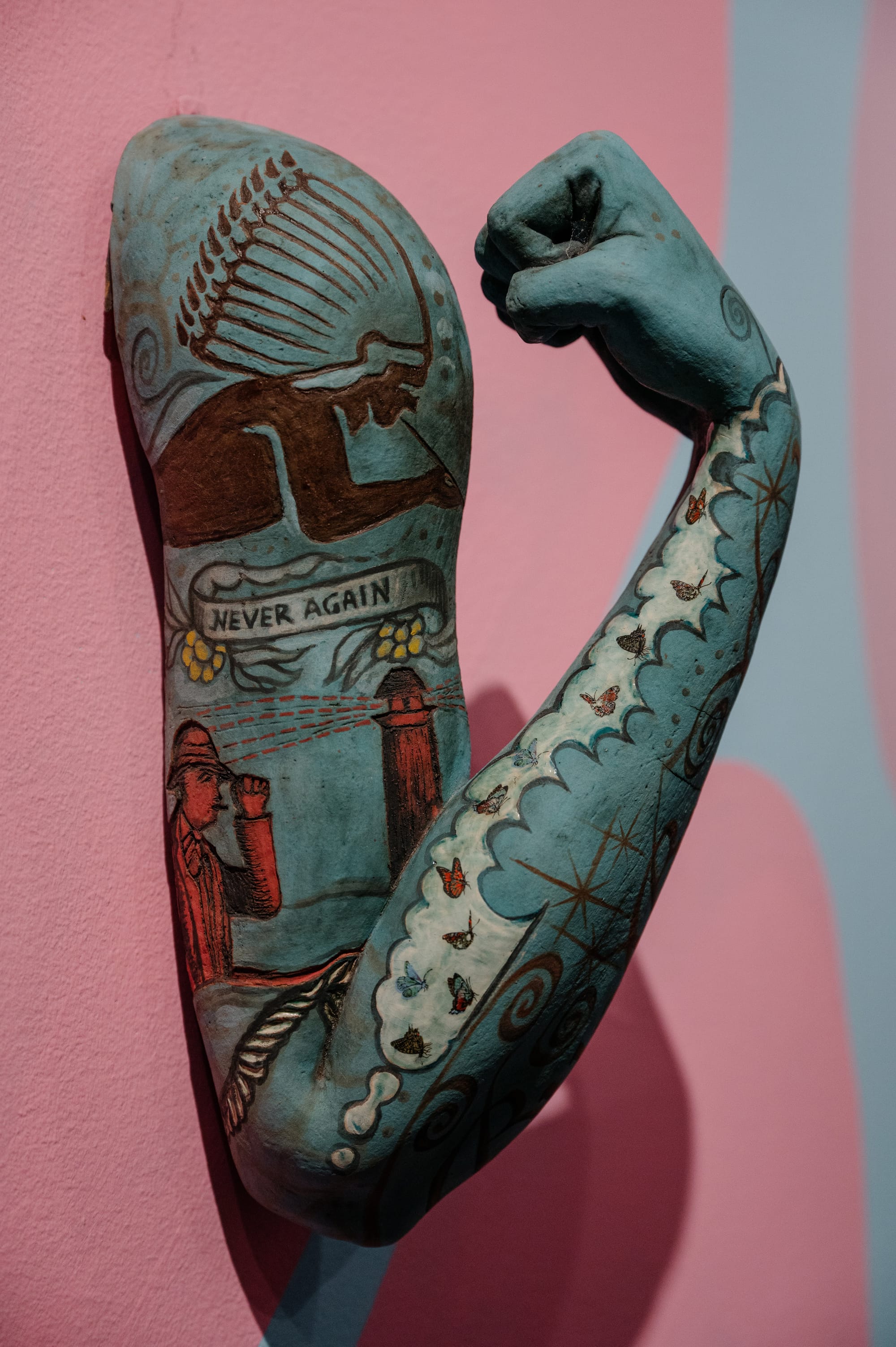 The exhibition features bubblegum pink walls backdropping a literal rainbow of printed materials. In addition to historic imagery that Marroquin has converted to a kind of psychedelic wallpaper, the gallery rebounds with recurring motifs, from large graphic flowers to women with winged hairdos flipping double birds with both hands. Marroquin's evocative ceramic portraits emerge from the walls like three-dimensional avatars of historical materials, giving them literal faces, and sometimes showcasing their tattoos as the visual record they've chosen to adorn themselves— as with "Never Again"(2010), a disembodied tattooed arm, or "Endurance" (2010), a portrait of Chicago artist, advocate, and art therapist Angela Scalisi, displaying the eponymous tattoo across her chest.