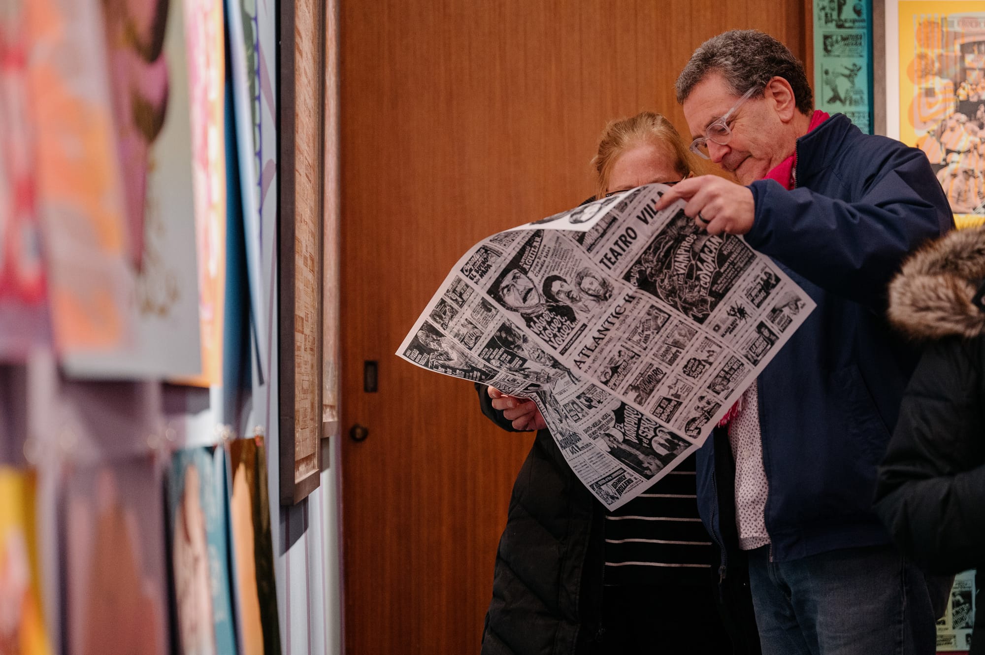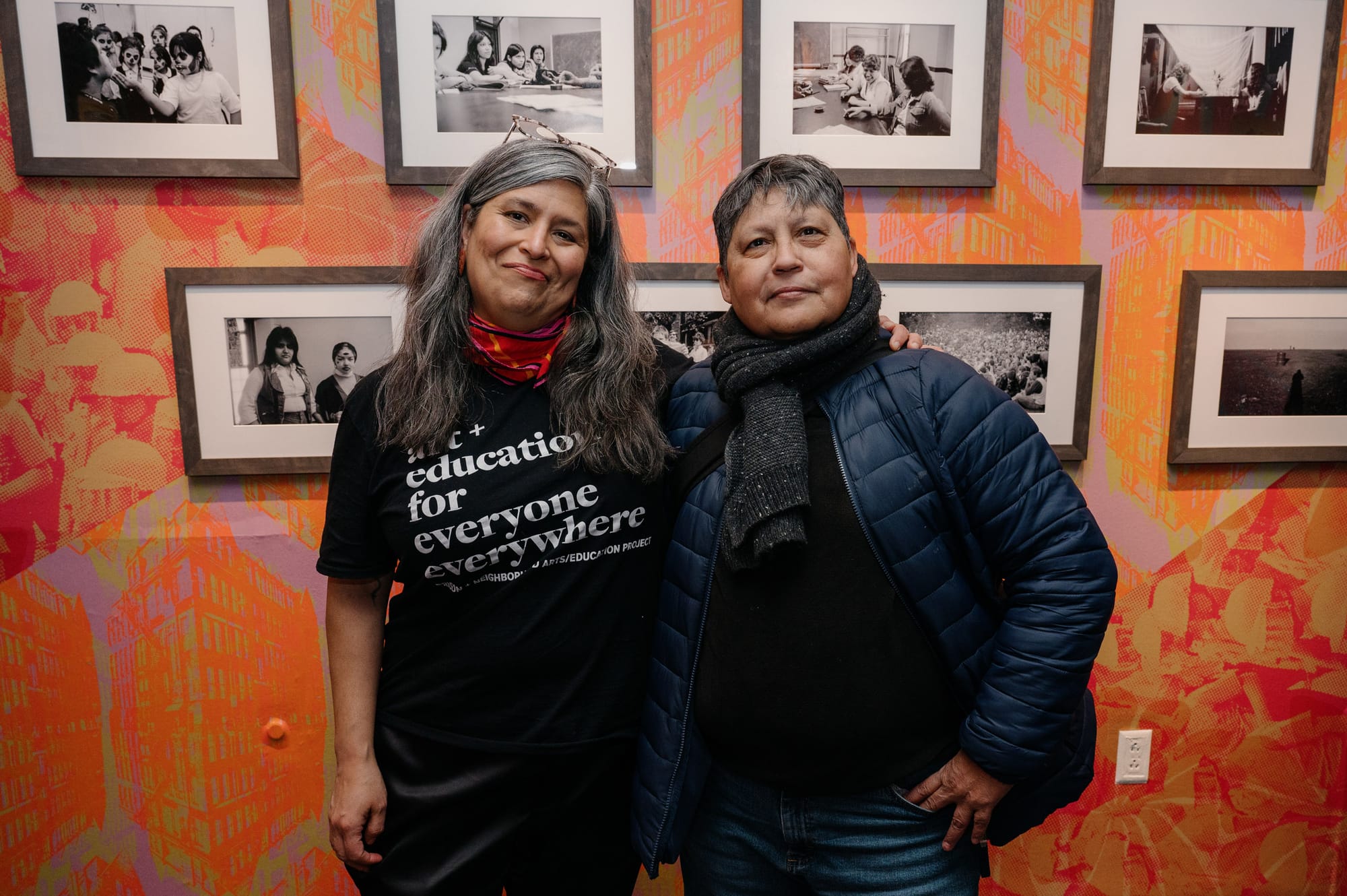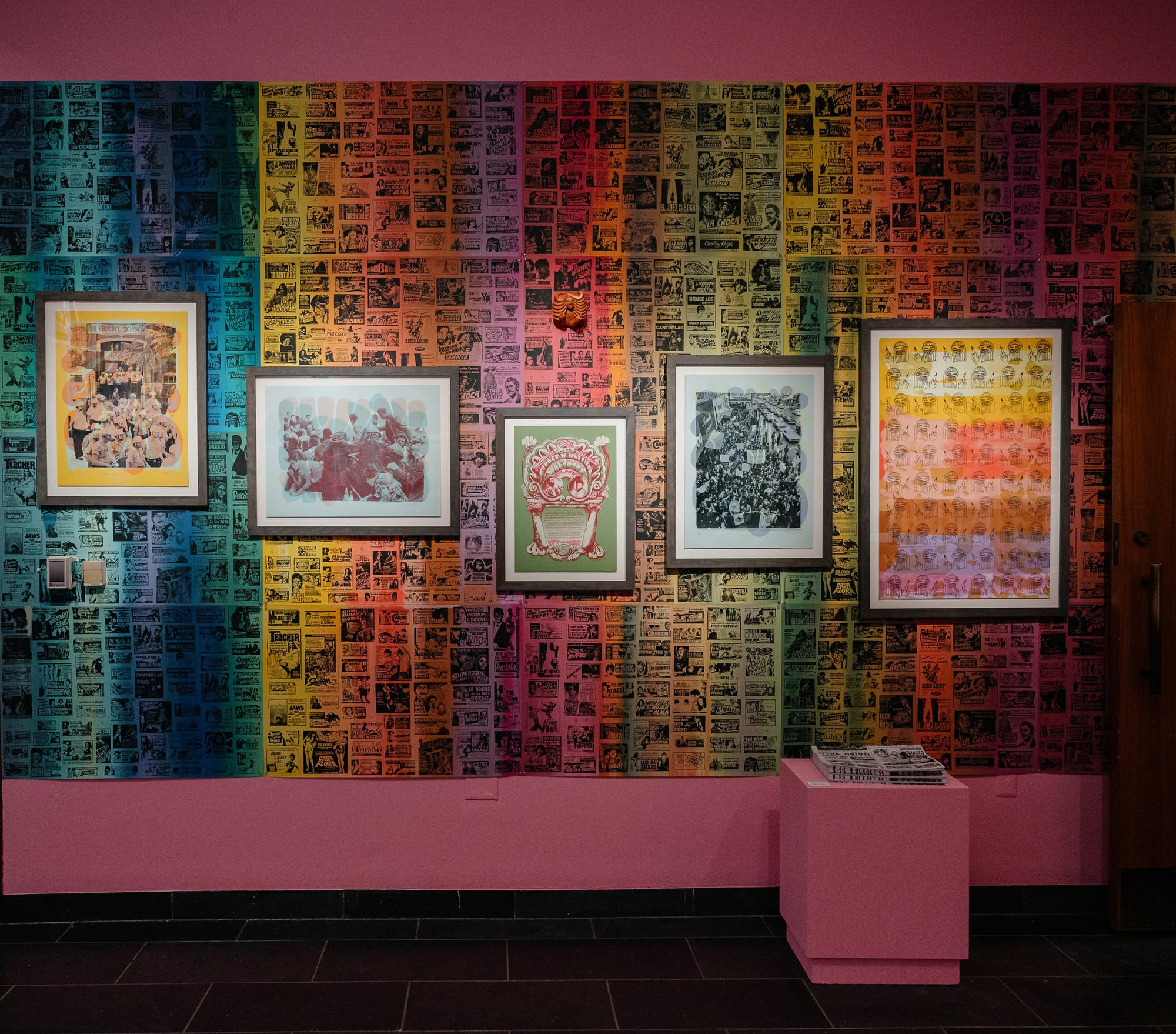 The installation displays Solis's black-and-white photos, which document Chicana and lesbian organizing from 1975–1990, among a colorful melange of collected movie posters, protest photographs, and graphics — photographs and prints that speak to the history of student organizing and protest in Chicago's Pilsen neighborhood, where Marroquin currently lives.