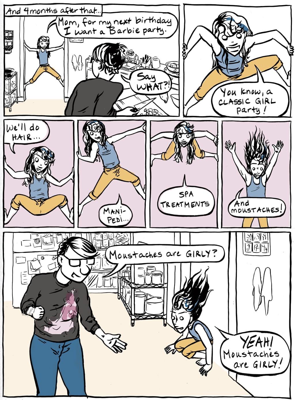 In her graphic novel, Primahood: Magenta, Cohen relates these kinds of quotidian stories about her daughter’s early childhood — among them, tales of playground fights, kid crushes, and lots of running around. Like many parents, as Cohen watches her daughter grow up, she’s always carefully considering the lasting consequences of her words and reactions. When her daughter is insulted that other kids called her a boy, her mother’s response is: “Maybe you have to teach them there’s yet another type of girl.” Cohen herself hasn’t worn a dress in years; her alter ego in the book is dubbed “Mama Pants.”