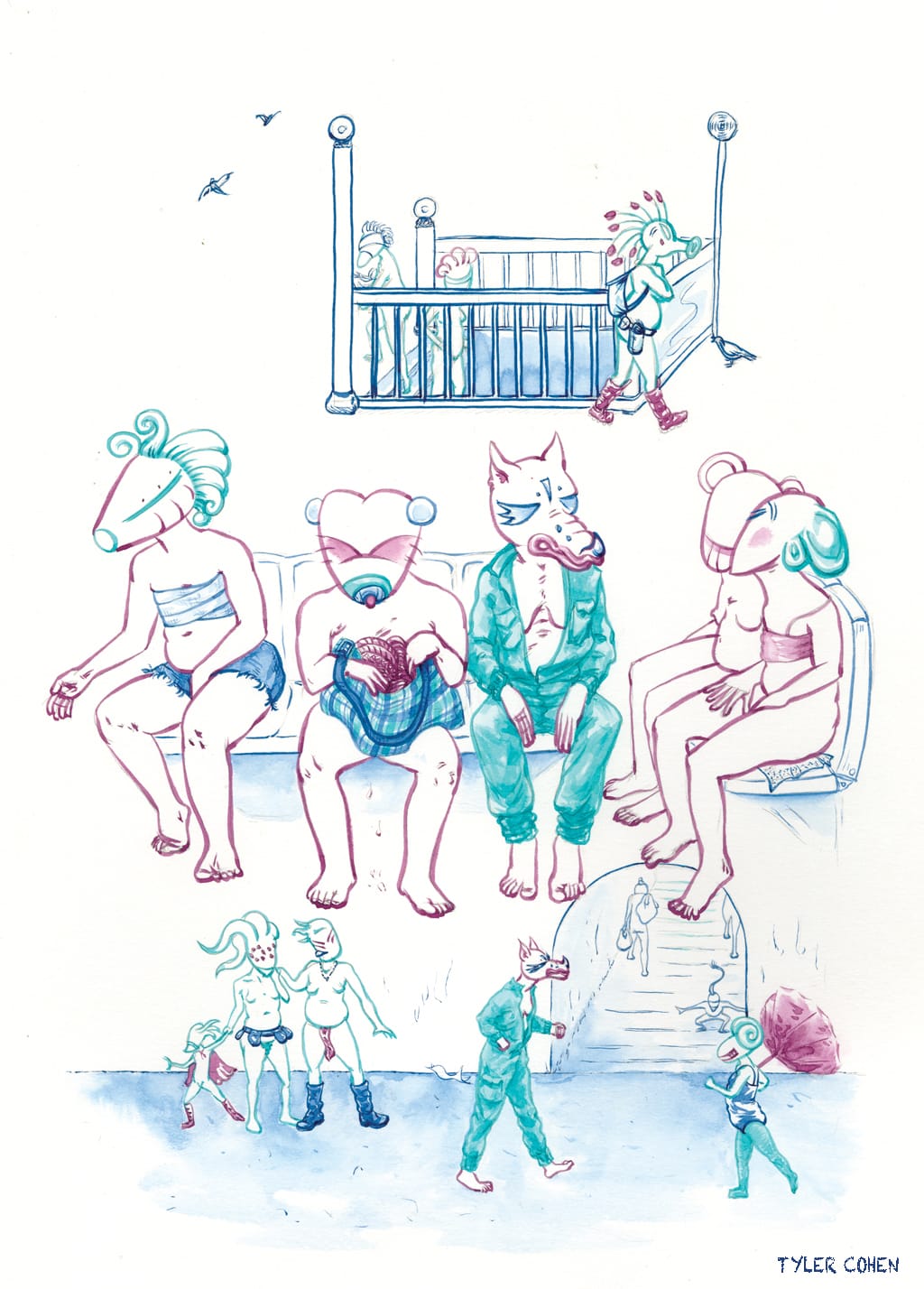 After her daughter was born, Cohen started integrating Primazonian babies and children into her drawings of the imaginary society. “It’s most definitely not an utopia,” she clarified. “While there is tremendous intimacy, there is also violence — the whole range. Perhaps in those moments of intimacy and support there are utopian moments, but that’s never all there is.” Drawing aesthetic inspiration from female surrealist painters, Cohen sees the Primazons as “of our world and not of our world — and in this way their world intersects with our own — and that of myself and my daughter.”