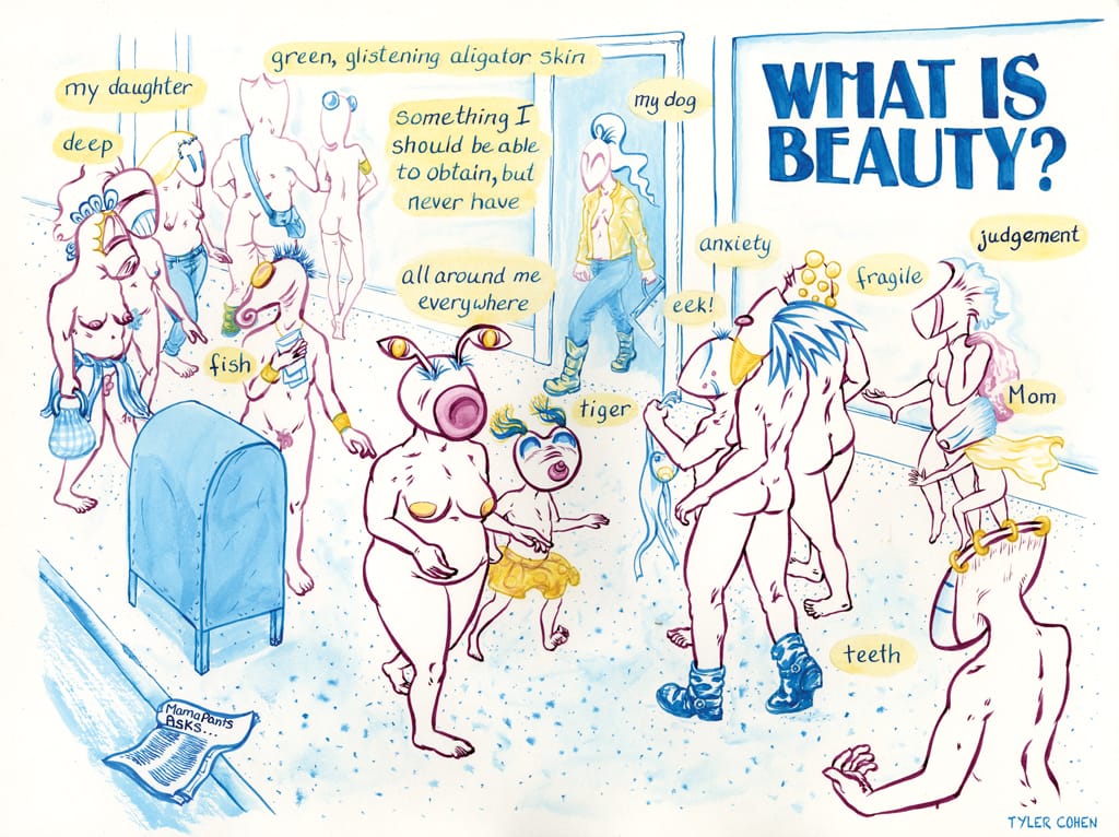 Cohen’s various panels often center around attempts to teach her daughter not only about gender politics, but also about sexuality and race. As Nene gets older, Mama Pants talks to her about the complexity behind mixed racial identities (Nene’s father is biracial), and she treats her daughter’s crushes on both boys and girls with equal weight. “I try my best to teach her about fluidities of race, gender, and sexuality — there are so many conversations!” Cohen told Hyperallergic in an email. “We are continuously up against the larger presence of media and her friends — whose thoughts and opinions have become more important to her than her parents at this age. Ultimately, she’s going to have to navigate to her own understandings.”