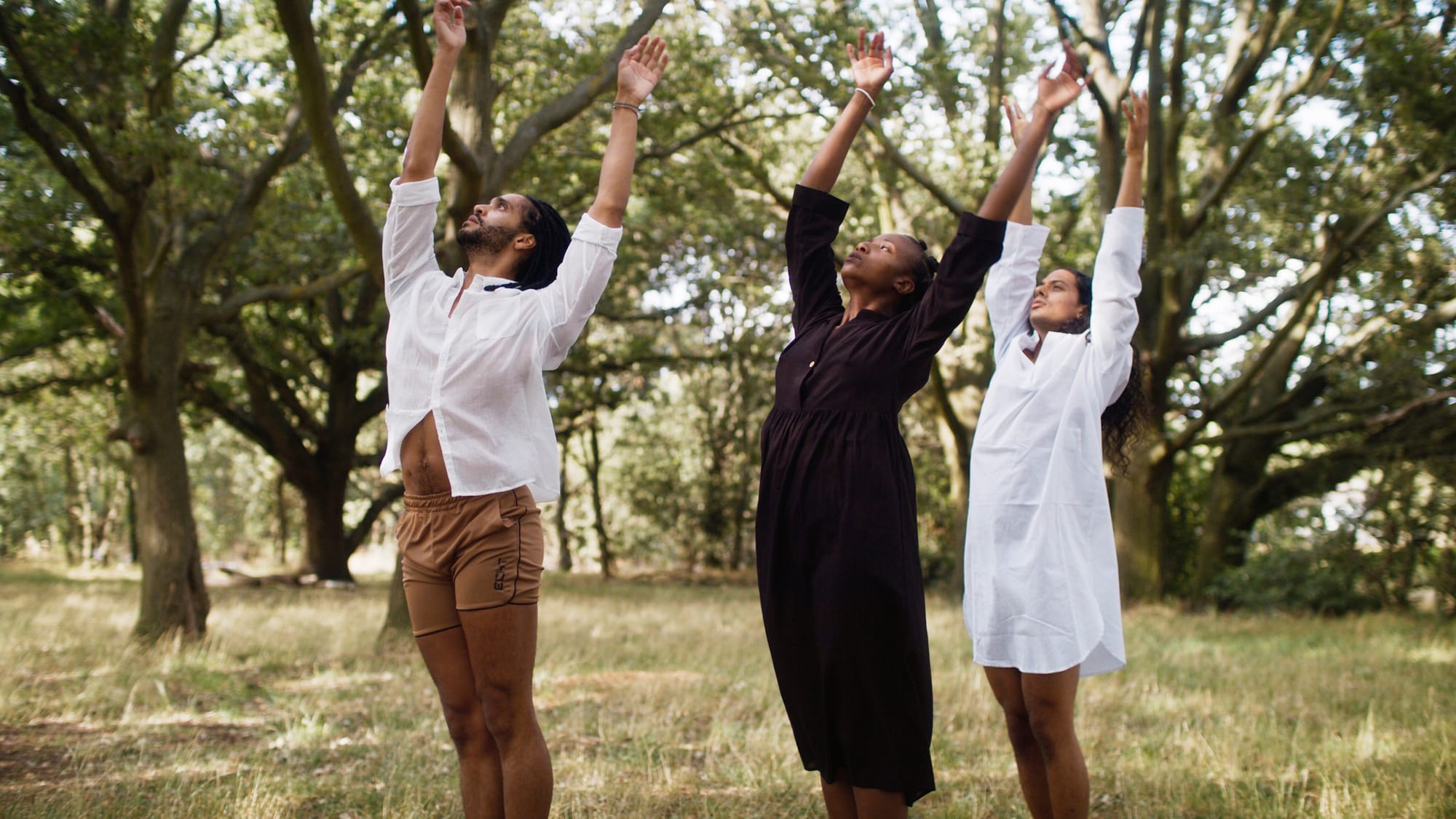 The works are varied, ranging from portraits to landscapes to carefully staged snapshots. London-based Egyptian filmmaker and photographer Adham Faramawy contributed a 2023 work titled "what it takes to make a forest" depicting three individuals, hands upheld, standing on a grass clearing surrounded by trees. Faramawy, who has Palestinian relatives, has created many similar images showing people reaching upward with their feet planted in riverbeds and other natural footings.