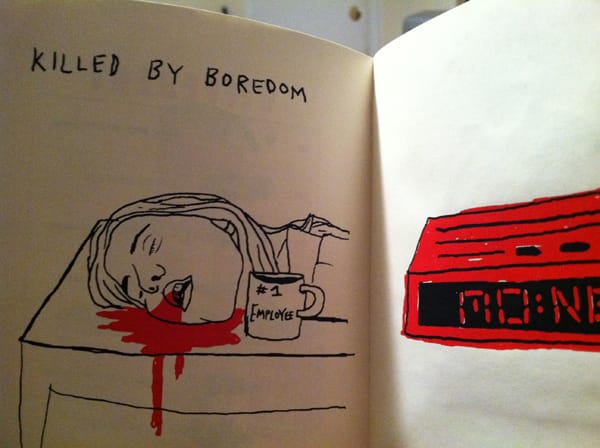 The best part about seeing all this print work together is the weirdness of it: contemporary print artists, many of whom come from a punk background, really let their freak flags fly. STO’s zine, Asleep at the Wheel, is chock-full of crude drawings paired with ambiguous phrases: “That ship has fucking sailed,” “He didn’t deserve it but it felt good to do,” “Inside of my coat pocket, I have a map of my hunger, and you are on it,” the last which is illustrated with a man bleeding from his eye and his mouth.