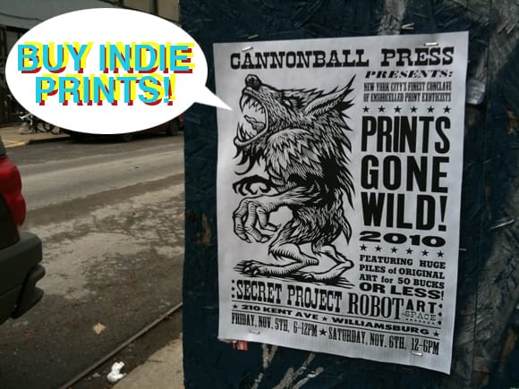 In you’re in the ’Burg today or tomorrow, check out the fifth-ever annual vernacular printacular Brooklyn affordable print fair! Titled Prints Gone Wild! the event at Secret Project Robot Art Space [http://www.secretprojectrobot.org] (210 Kent Avenue, Williamsburg, Brooklyn — Google map [http://maps