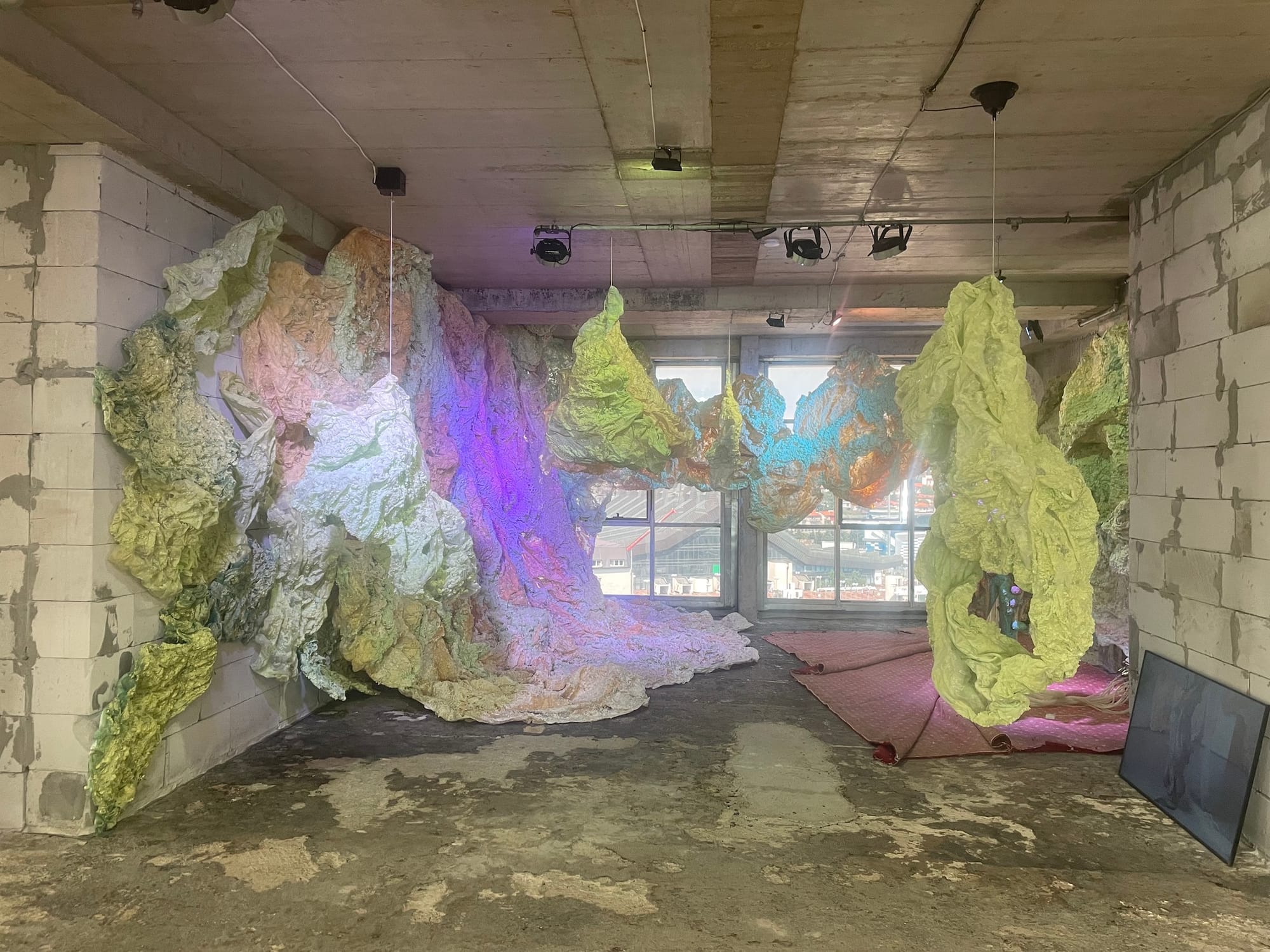 In her installation “there are crossroads where ghostly signals flash from the traffic” (2022), Edona Kryeziu investigates what Arts of the Working Class called the “geopolitical, economic, and emotional conditions of waiting in relation to the unresolved sovereignty of Kosovo.” Towers of unprocessed shipping boxes hint at a logistical, and bureaucratic, separation between Kosovans and the outside world.